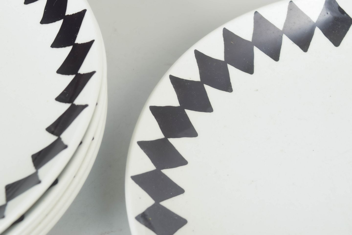 Karin Björquist for Gustavsberg, set of six small lunch plates “Svart Ruter”.Set consisting of six small lunch plates in porcelain featuring a distinctive black diamond pattern, designed in a simple and functional style typical of the period.
