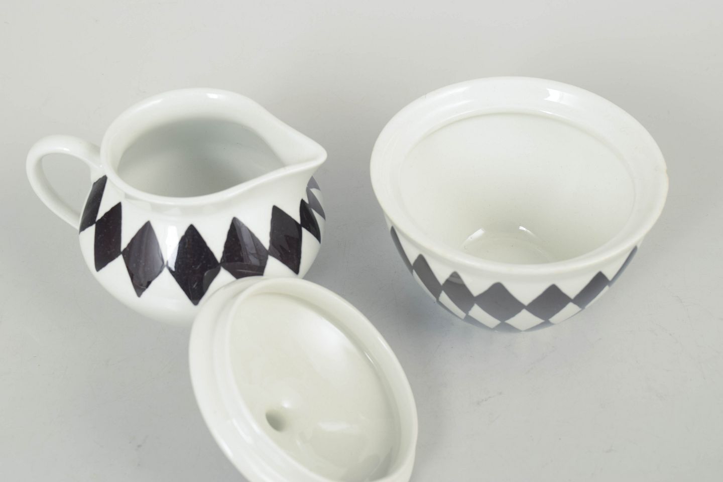 Karin Björquist for Gustavsberg, creamer set “Svart Ruter”.Set consisting of lidded sugar bowl and creamer in porcelain with a distinctive black diamond pattern, designed in a simple and functional style typical of the period.