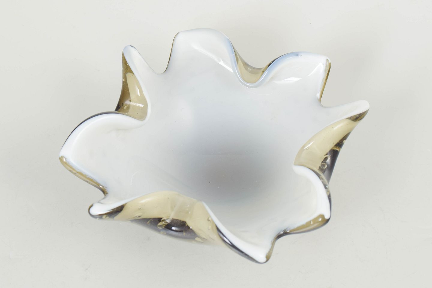 Murano art glass bowl.Decorative mouth-blown bowl with organic form, undulating rim and controlled air bubbles in clear and golden glass.
