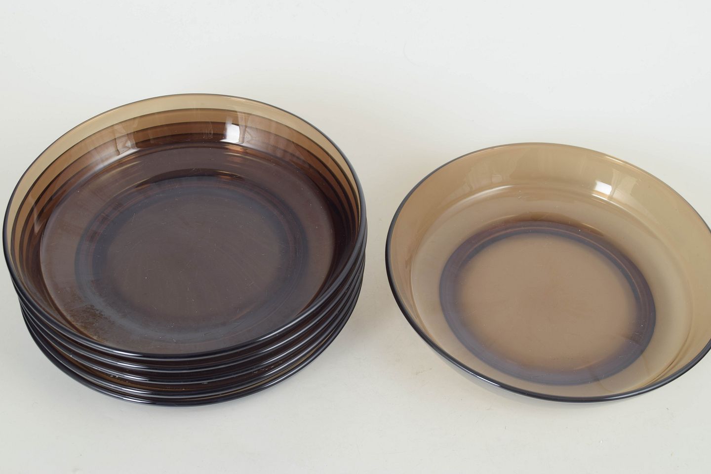 Vereco, set of six deep plates.Set of six deep plates in pressed glass with a low, wide form and smoky tint, produced in France and marked by the manufacturer.