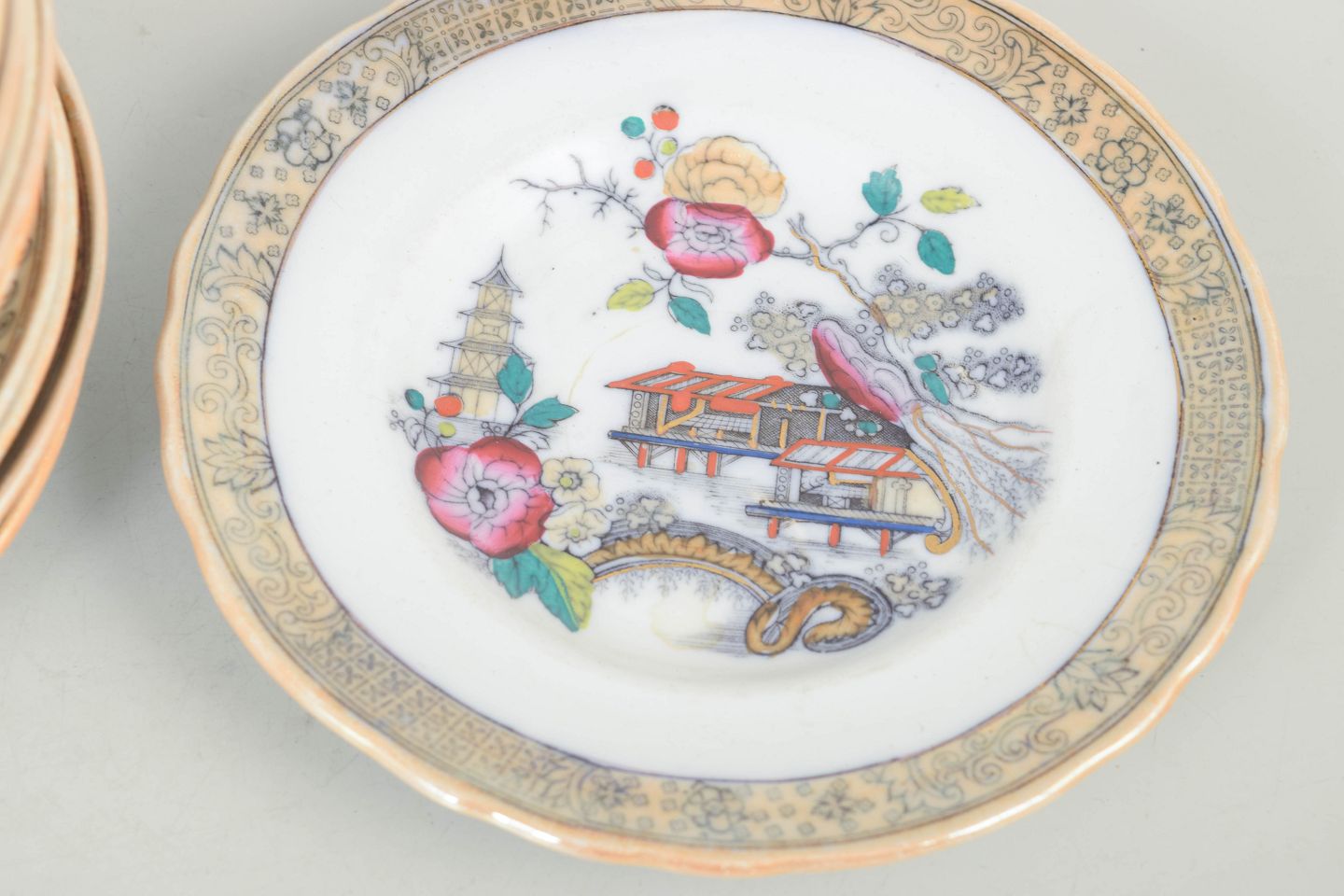 Rörstrand Japan, set of sixteen small plates.Decorative small faience plates with polychrome decoration in an orientalist Japanese style featuring pagoda motifs, buildings, bird and floral elements. Model Japan, produced between 1866–1925 and dated to the 1880s.