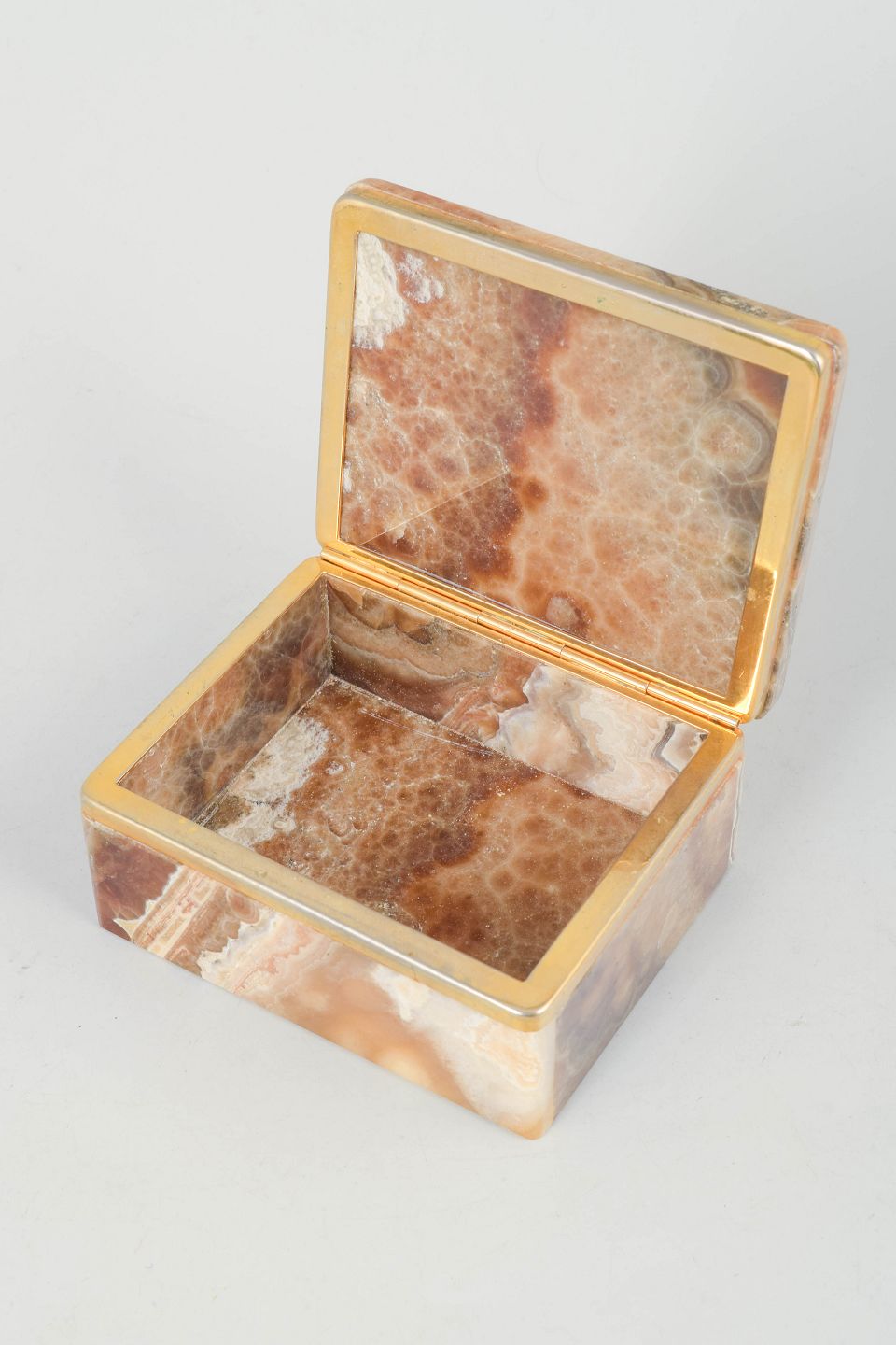 Italian alabaster, box from the 1940s.Square lidded box in alabaster with striking multicoloured veining in brown, beige and cream tones. Finished with an elegant brass band that emphasises the classic Art Deco aesthetic.