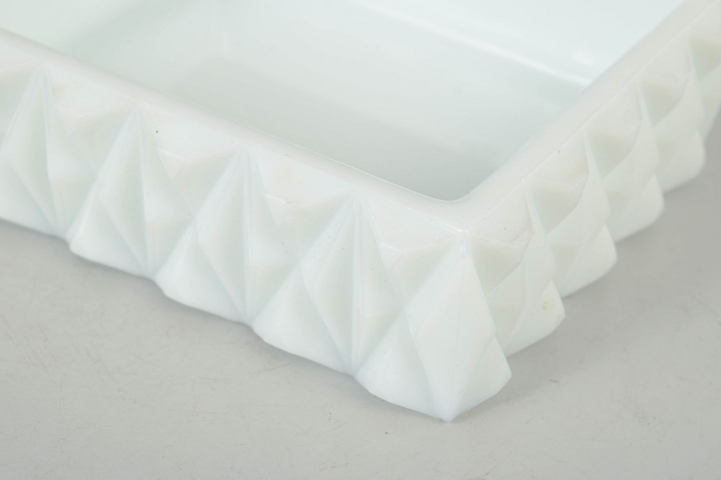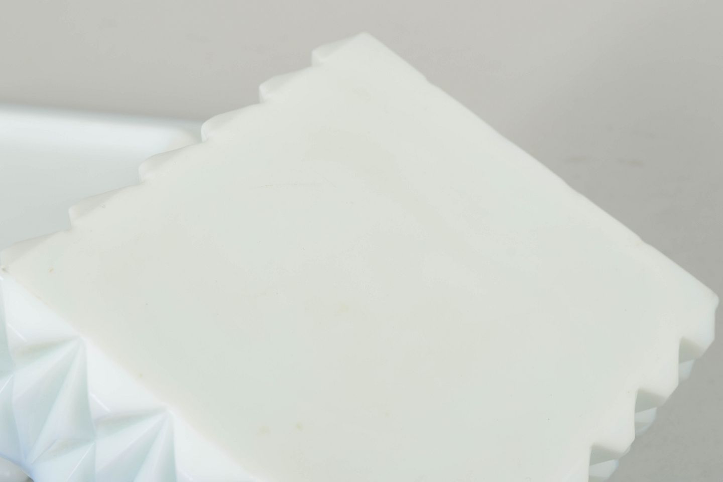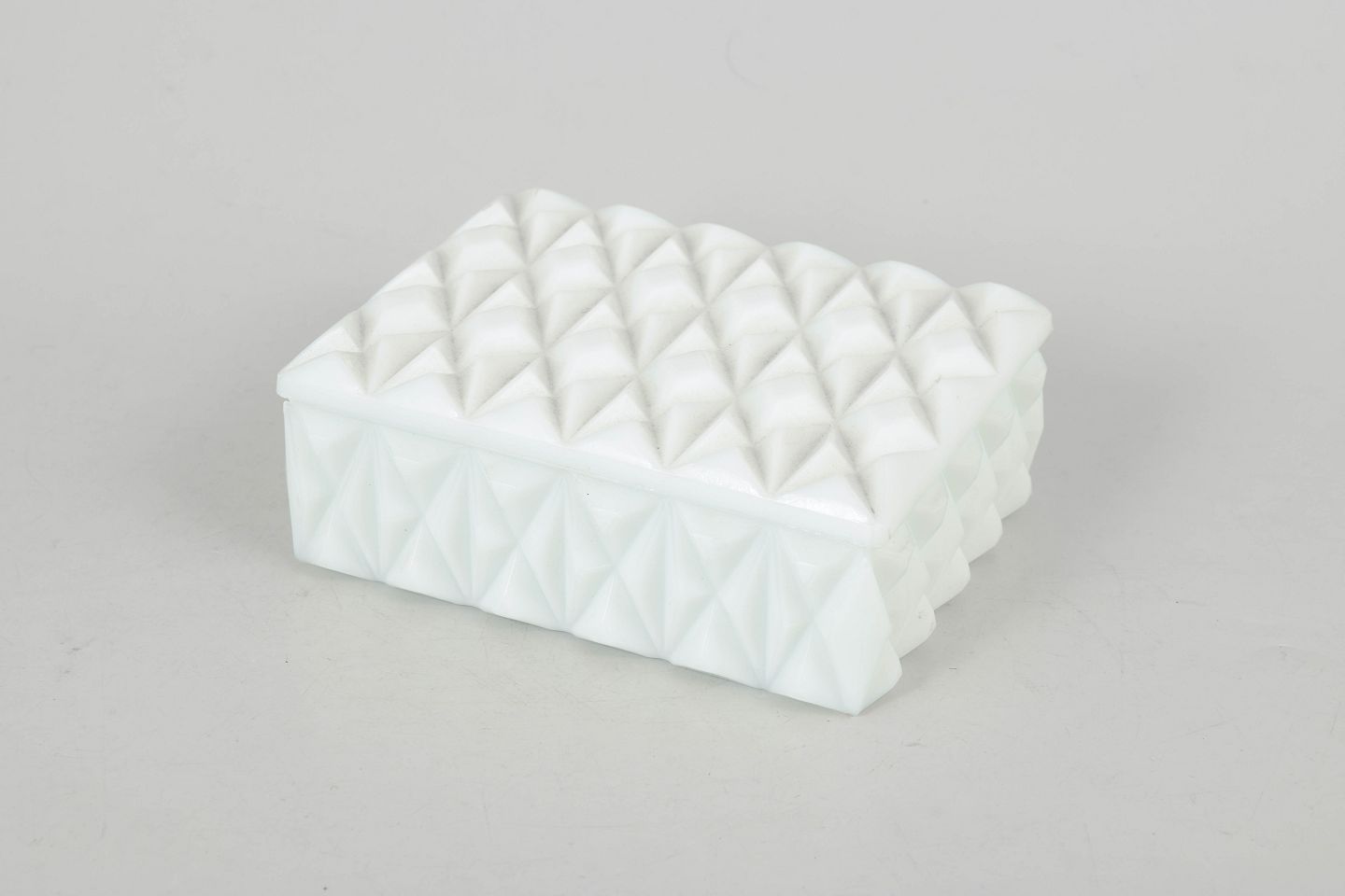 Italian opaline glass, box from the 1940s.Rectangular lidded box in opaline glass with geometric relief decoration of repeating pyramid motifs. The white material has a subtle translucency that enhances the structured Art Deco design.