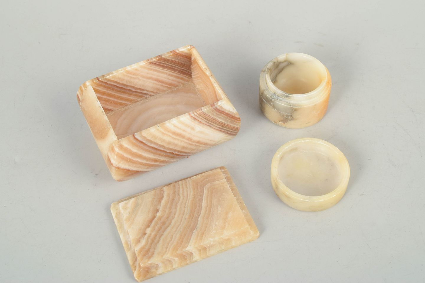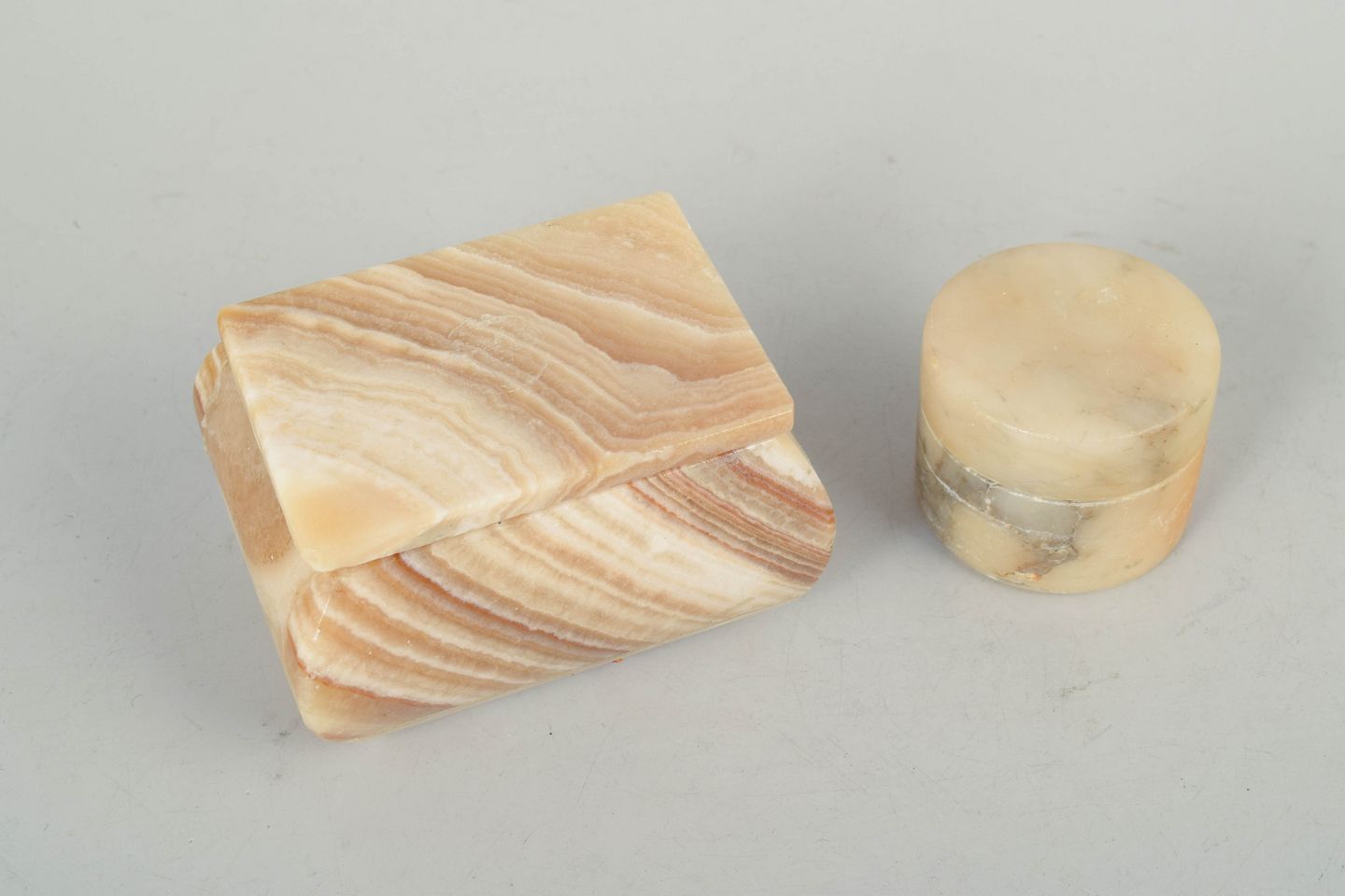 Italian alabaster, boxes from the 1940s.Two decorative boxes in polished alabaster with natural veining in warm beige and honey tones. Comprising one square lidded box and one circular box, both reflecting a characteristic Art Deco aesthetic.