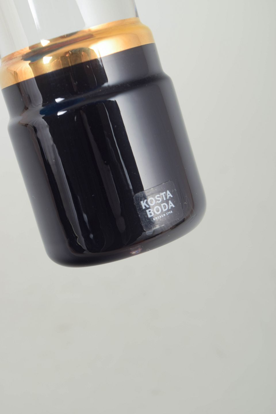 Åsa Jungnelius for Kosta Boda, glass sculpture in the form of a lipstick.Slender layered glass sculpture in the form of a lipstick, with a cylindrical base in dark glass, ring-shaped elements in golden and clear tones, and an angled top in pink glass.