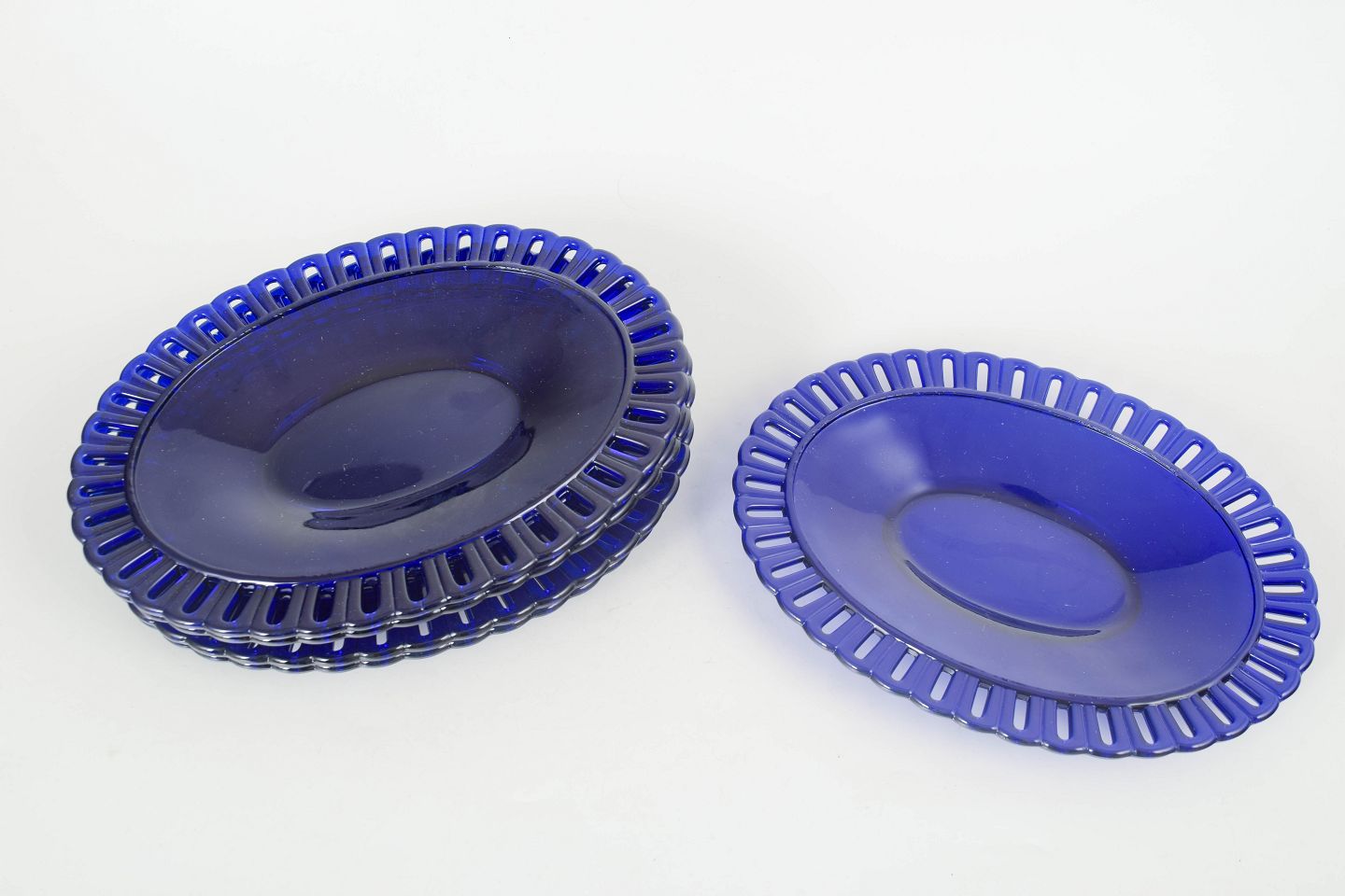 William Stenberg for Gullaskruf, set of six “Filigran” plates.Elegant pressed glass plates in deep cobalt blue with a distinctive openwork rim in filigree design. A striking example of Swedish glass design from the mid 20th century.