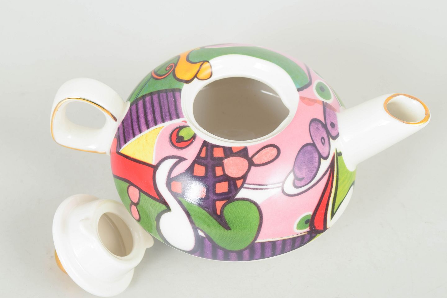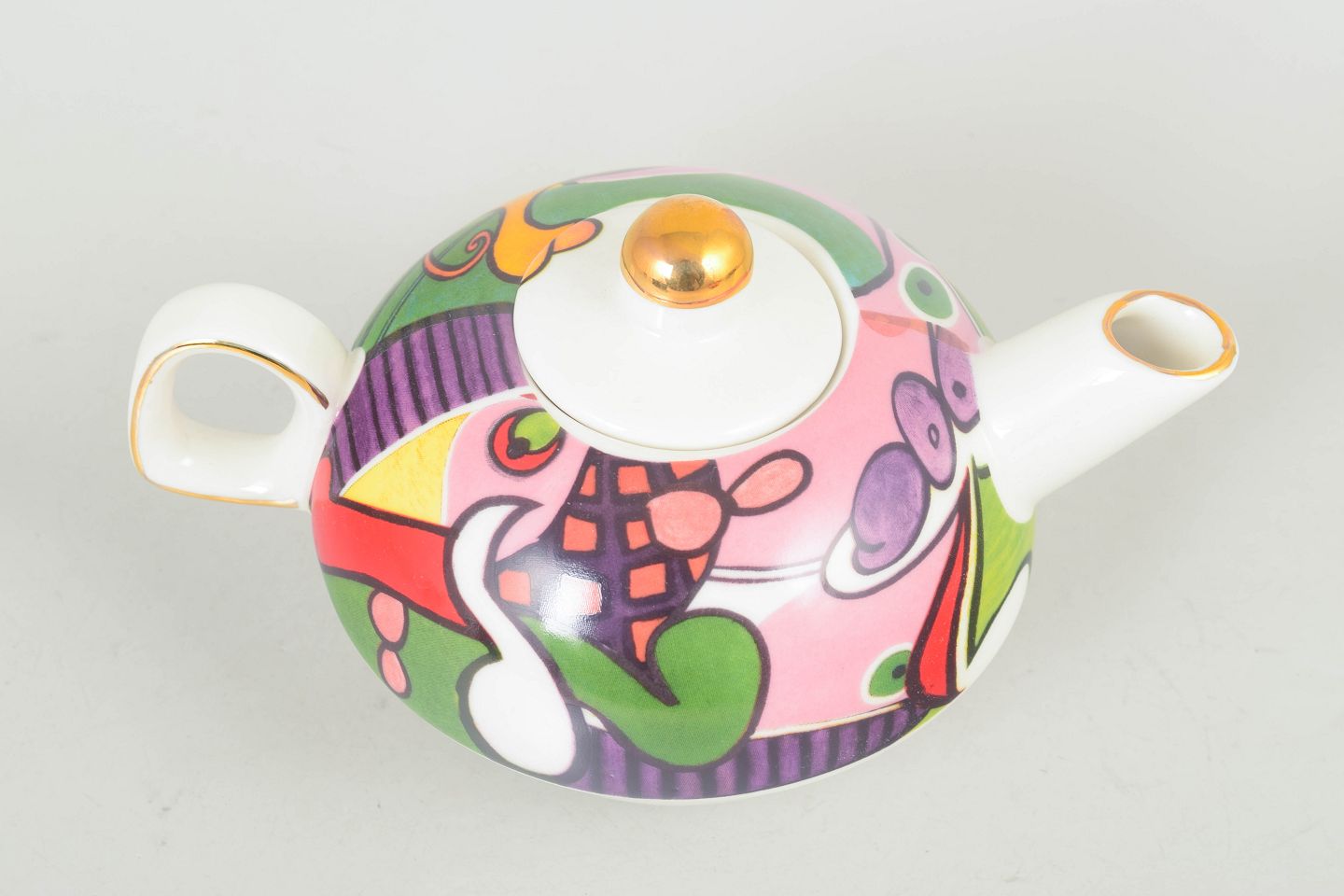 Picasso teapot.Porcelain teapot with lid, marked Picasso. Rounded form with colourful decoration in strong contrasts and gilt details on the finial and spout, typical of late 20th century production.