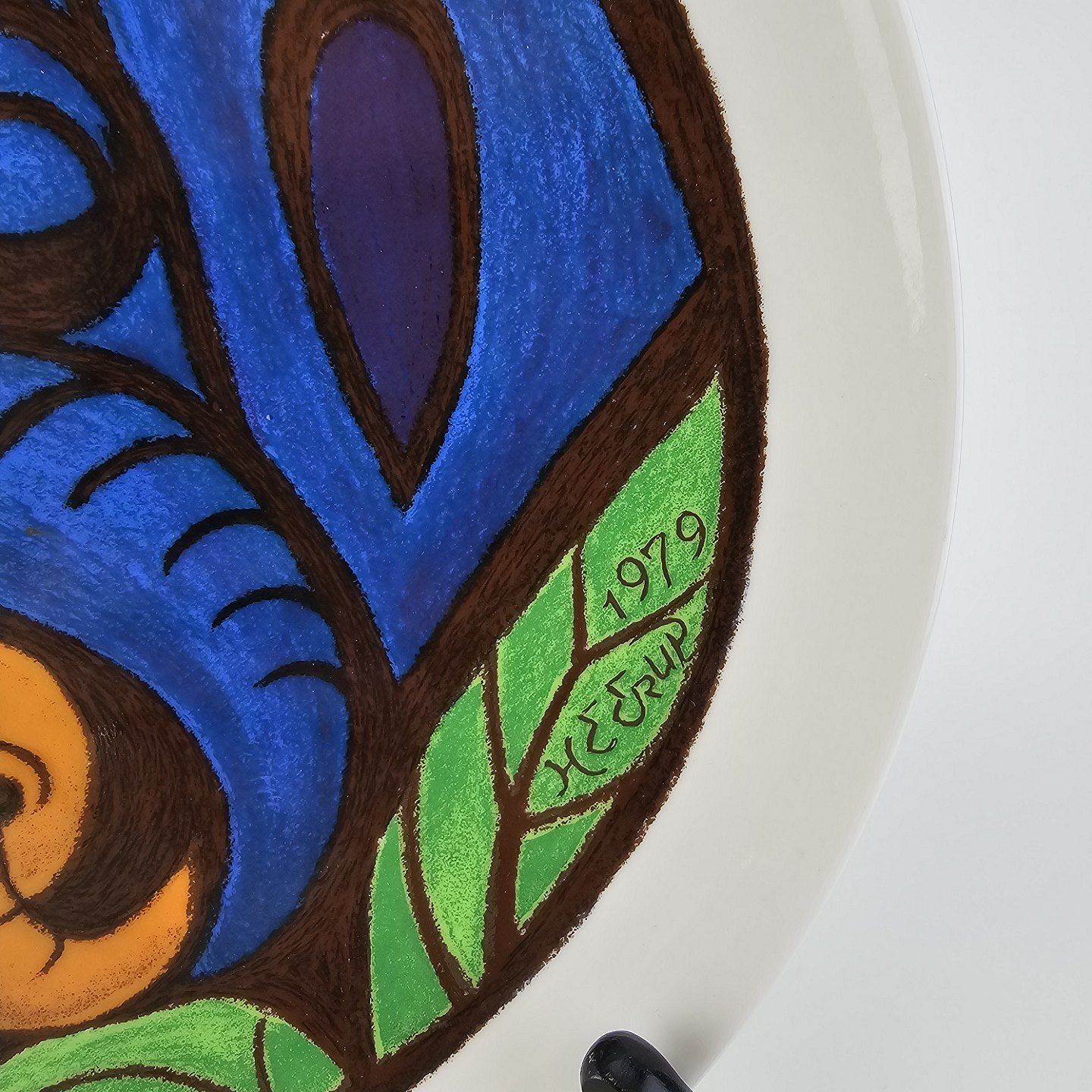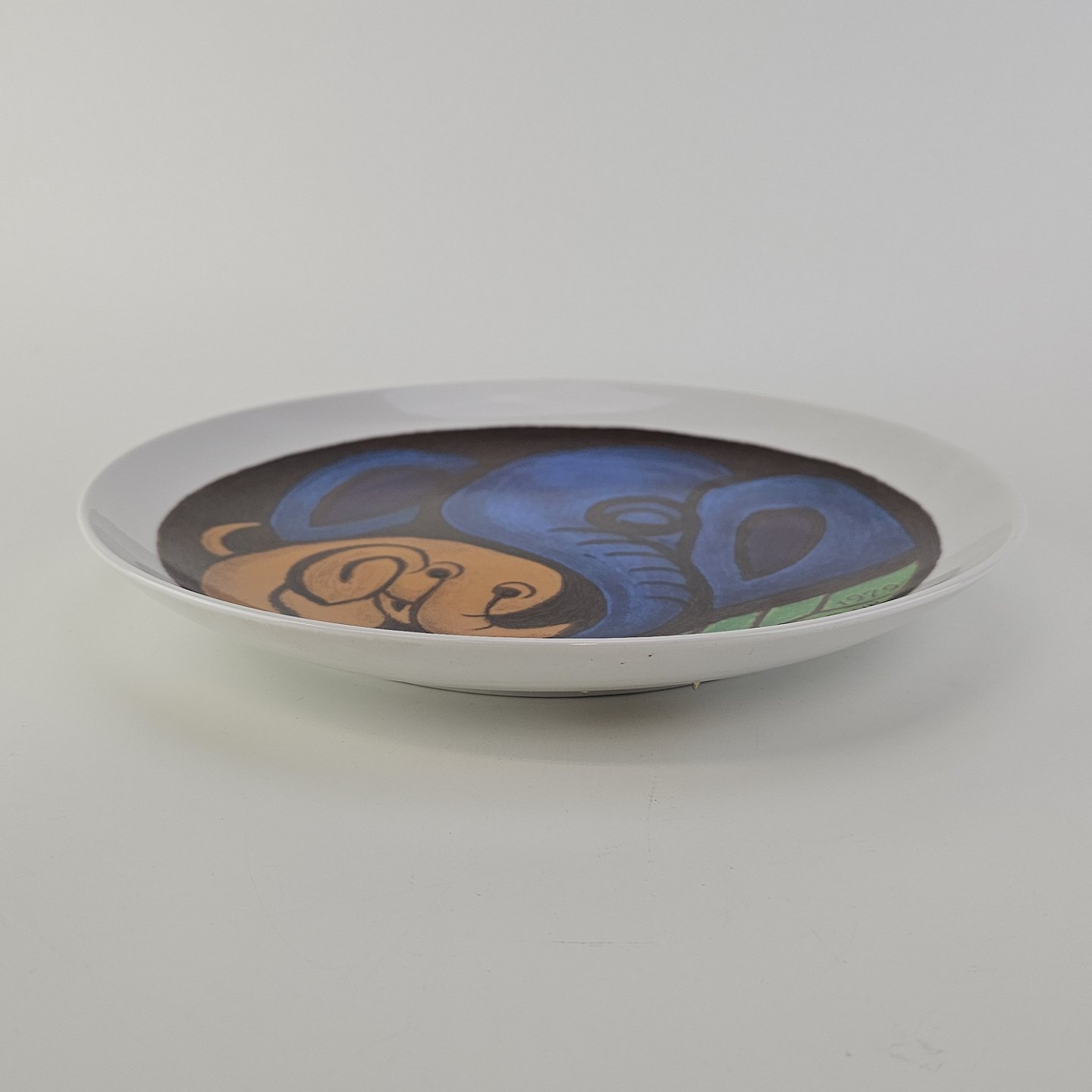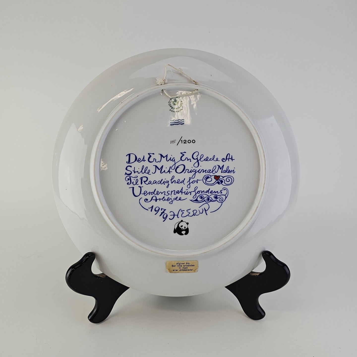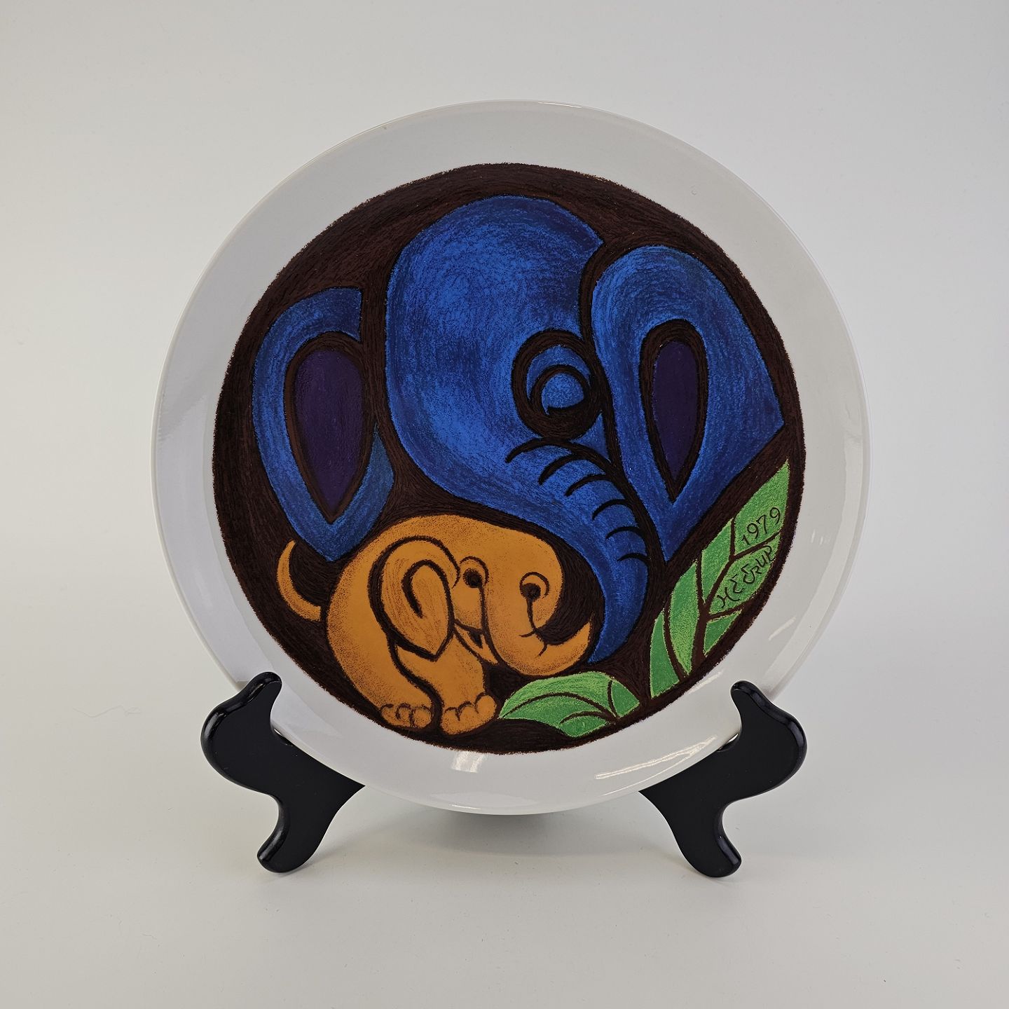 Platte af kongeligt porcelæn med motiv af elefanter i blå, orange og grønne farver. Nr. 115/1200Signeret Heerup 1979 og dedikeret til Verdensnaturfonden