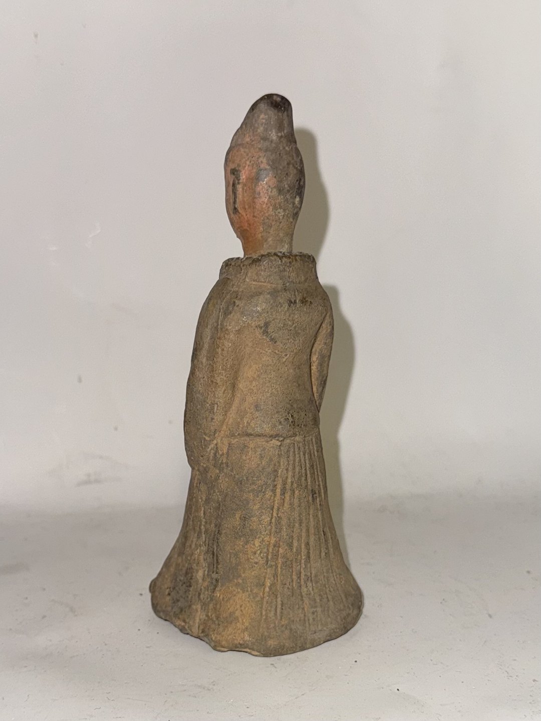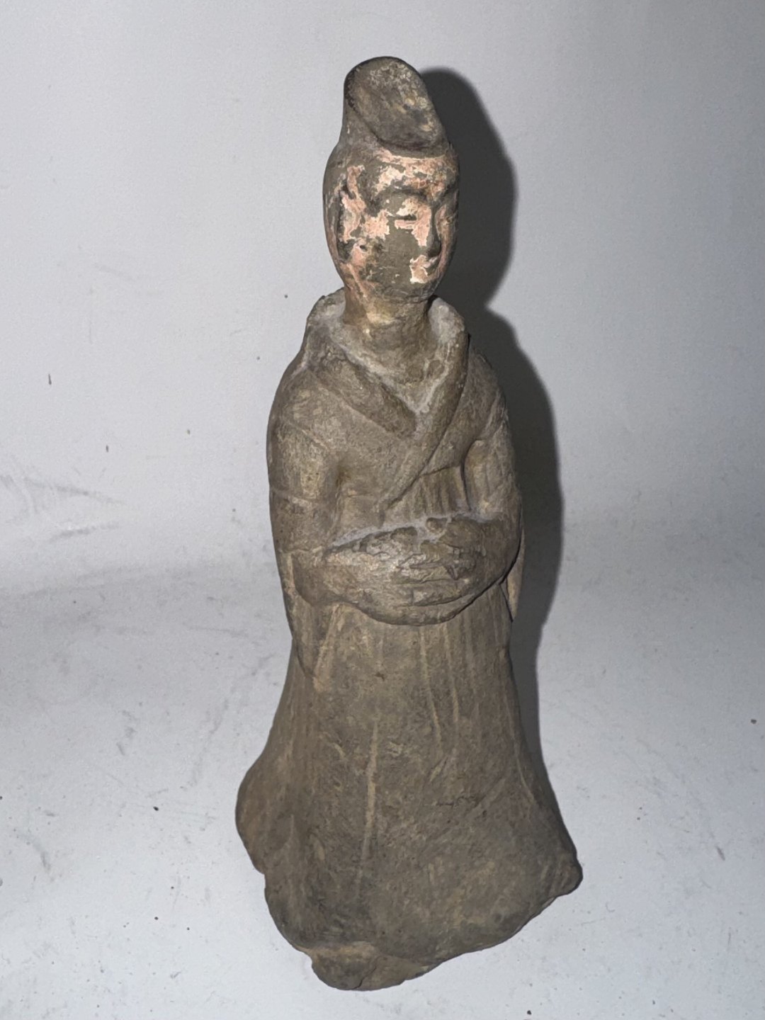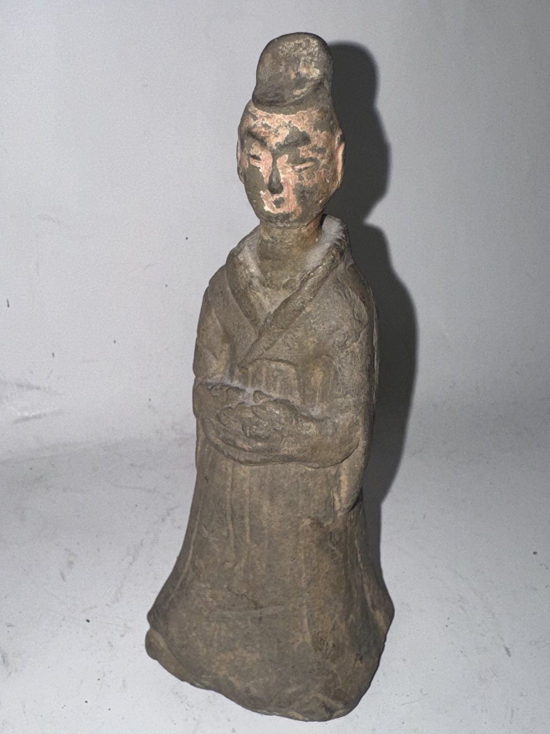 Chinese ceramic grave figurine from the Tang Dynasty (618-907 AD). This type of figurine was placed in the grave with the deceased. The figurine could, for example, symbolize a servant or maidservant for the afterlife. This figurine has probably been fully glazed, but only remnants of glaze are visible on the face. No damage or repairs. H. 14.5 cm Dealer