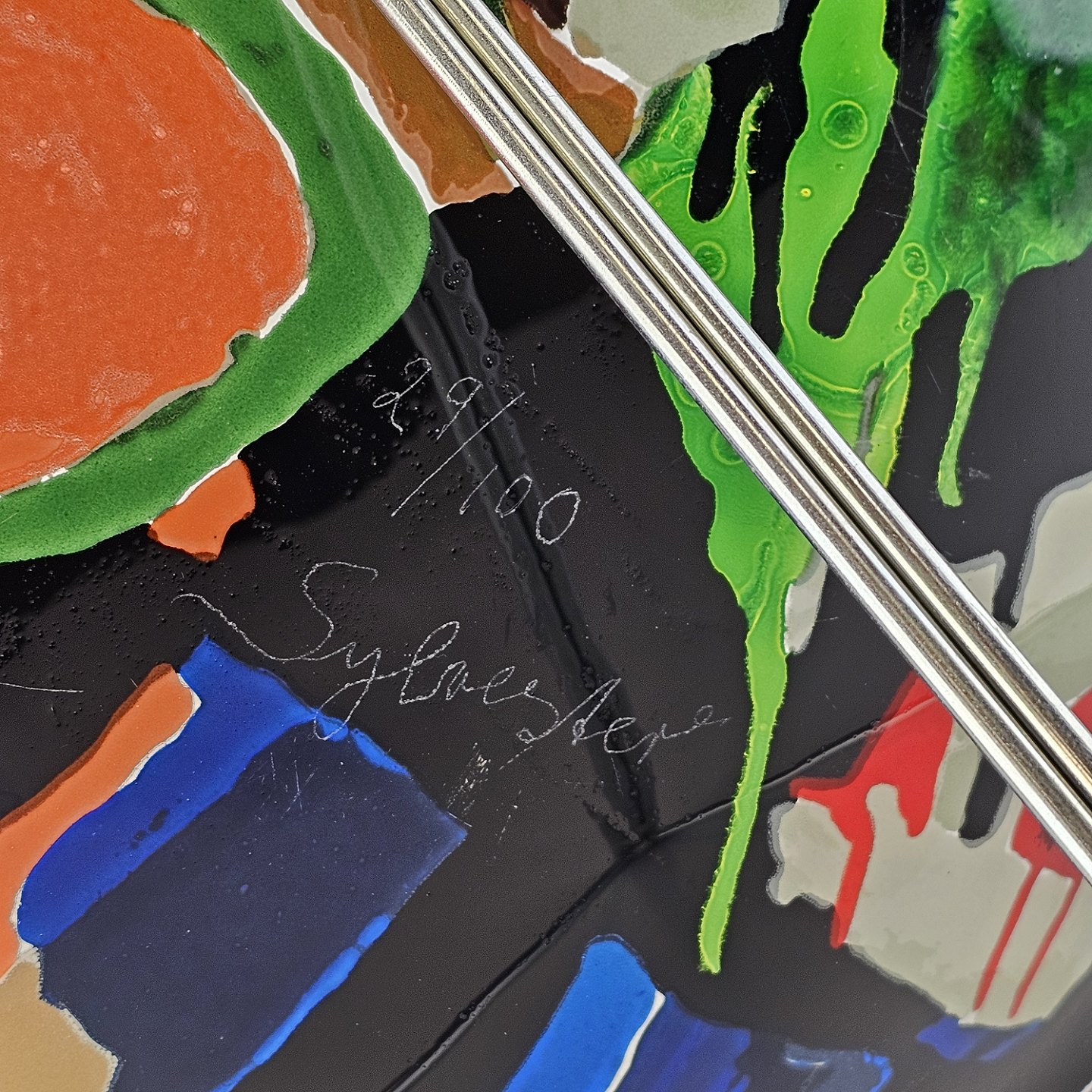 Platte i glas med abstrakt motiv i flere farver på sort baggrundNr. 29/100, medfølgende metal holder.