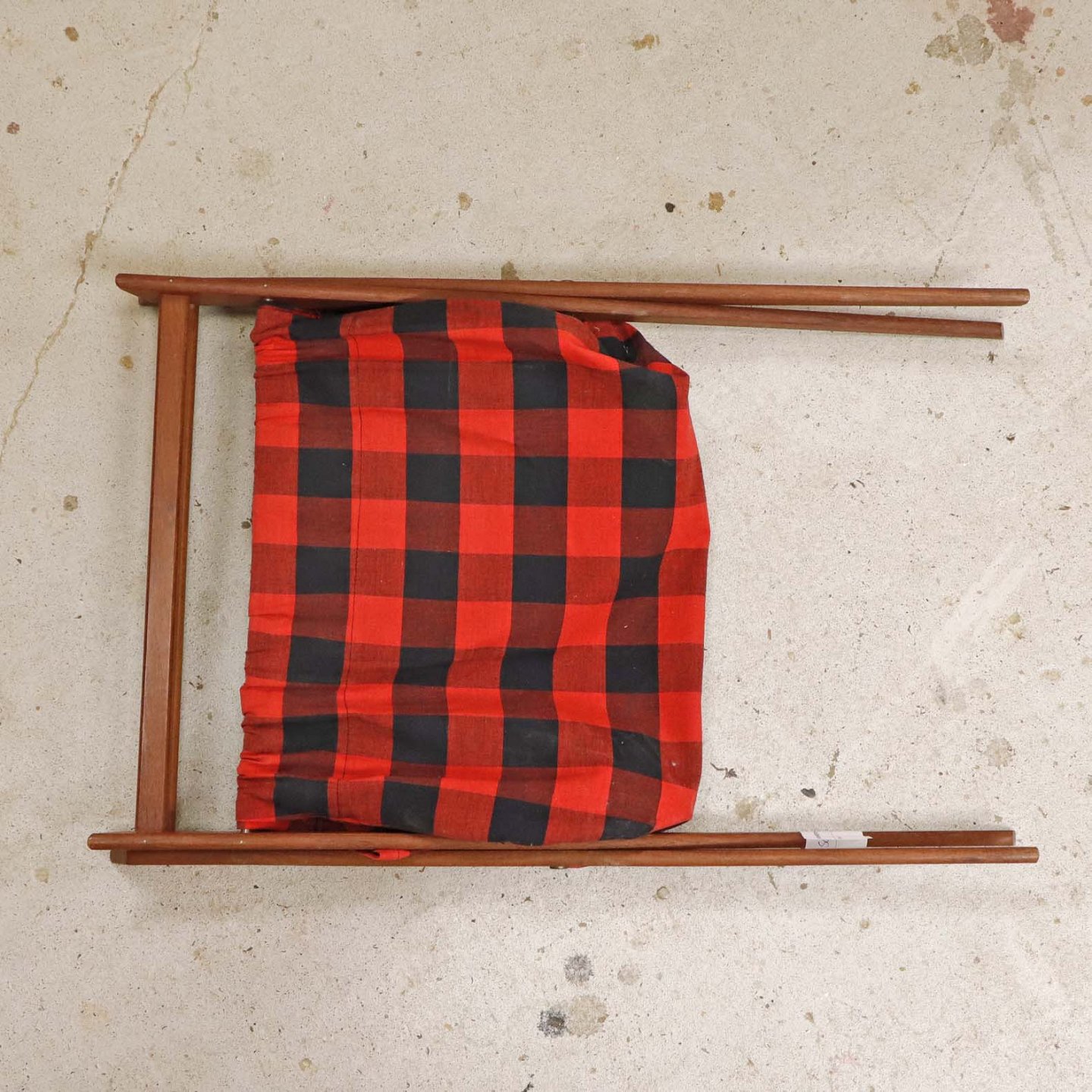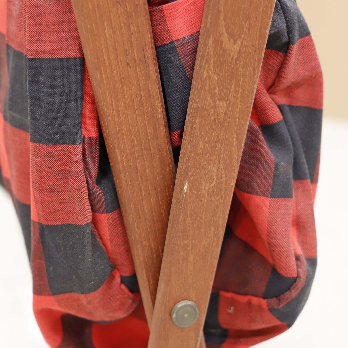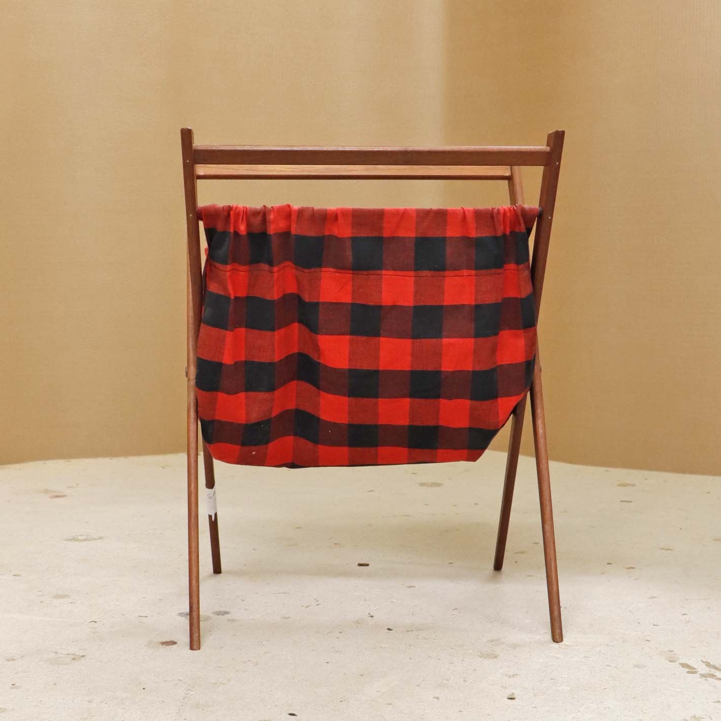 Magasinholder med stel i teaktræ med påmonteret bomuldsstof med mønster af røde og sorte tern. Holderen har to indvendige lommer langs den ene side. Kan også bruges til garn. Holderen kan klappes sammen.Producent ukendt