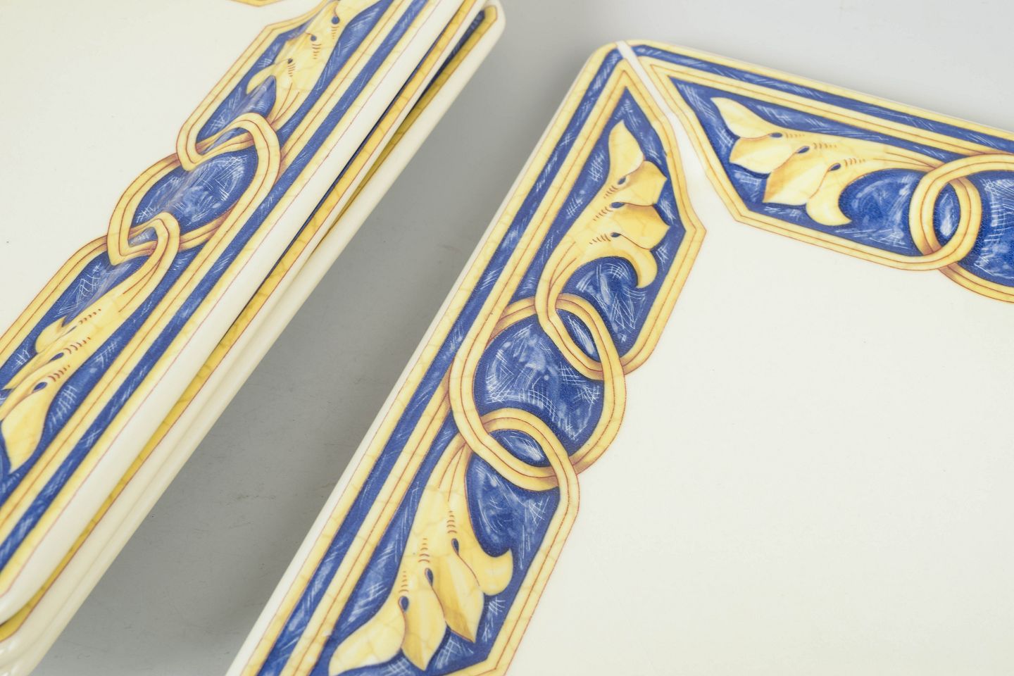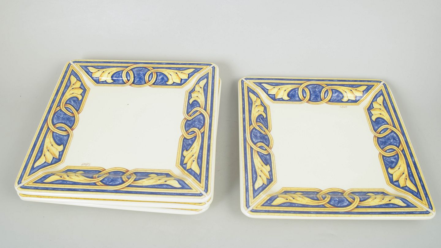 Tiffany Boutique, set of four dinner plates.Decorative ceramic set consisting of four dinner plates with a wide border in blue, yellow and gilt tones with ornamental motifs.