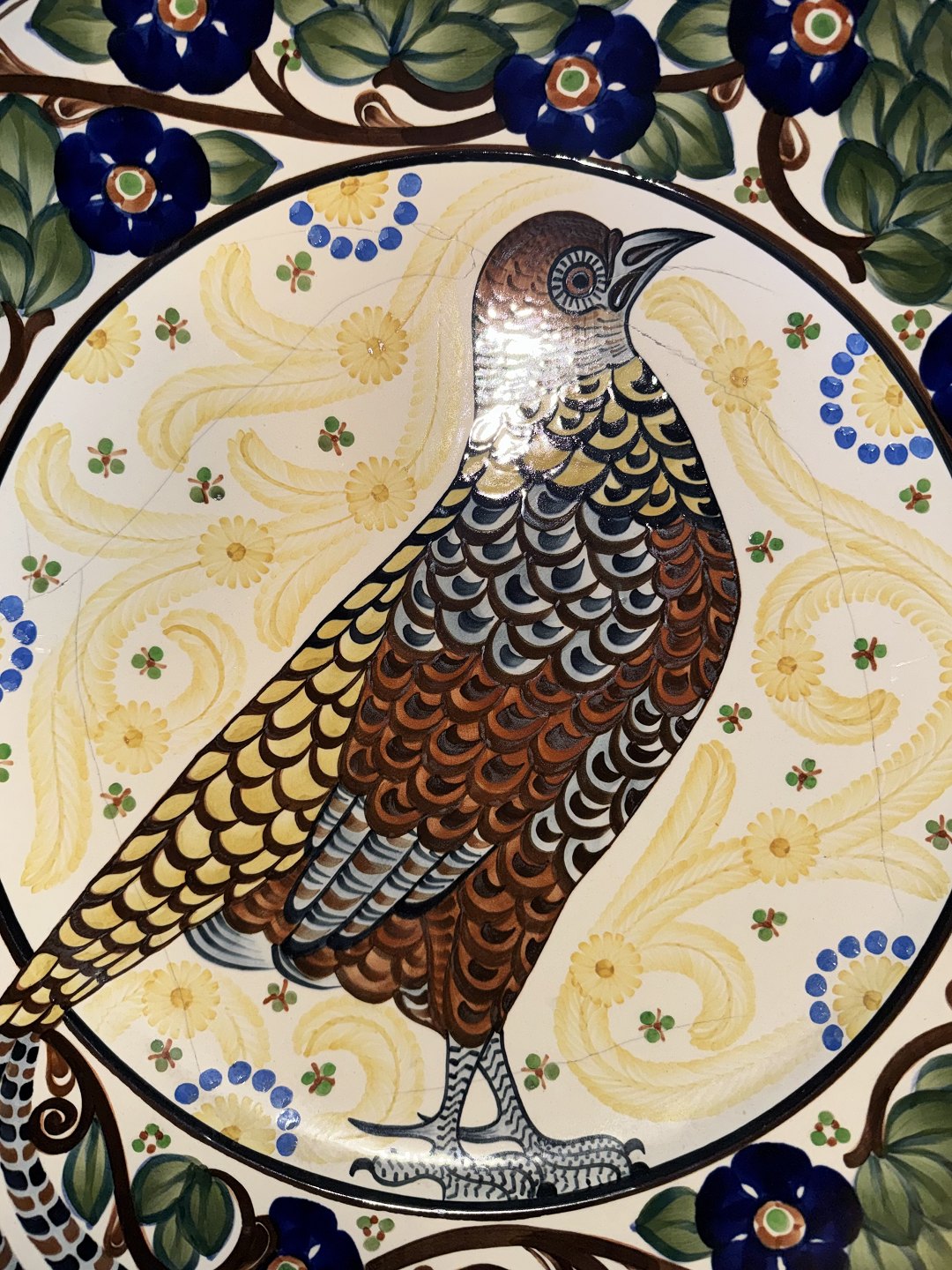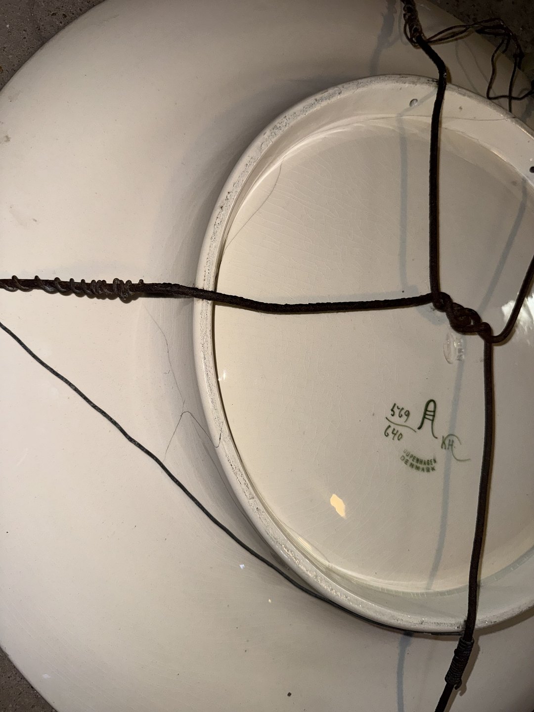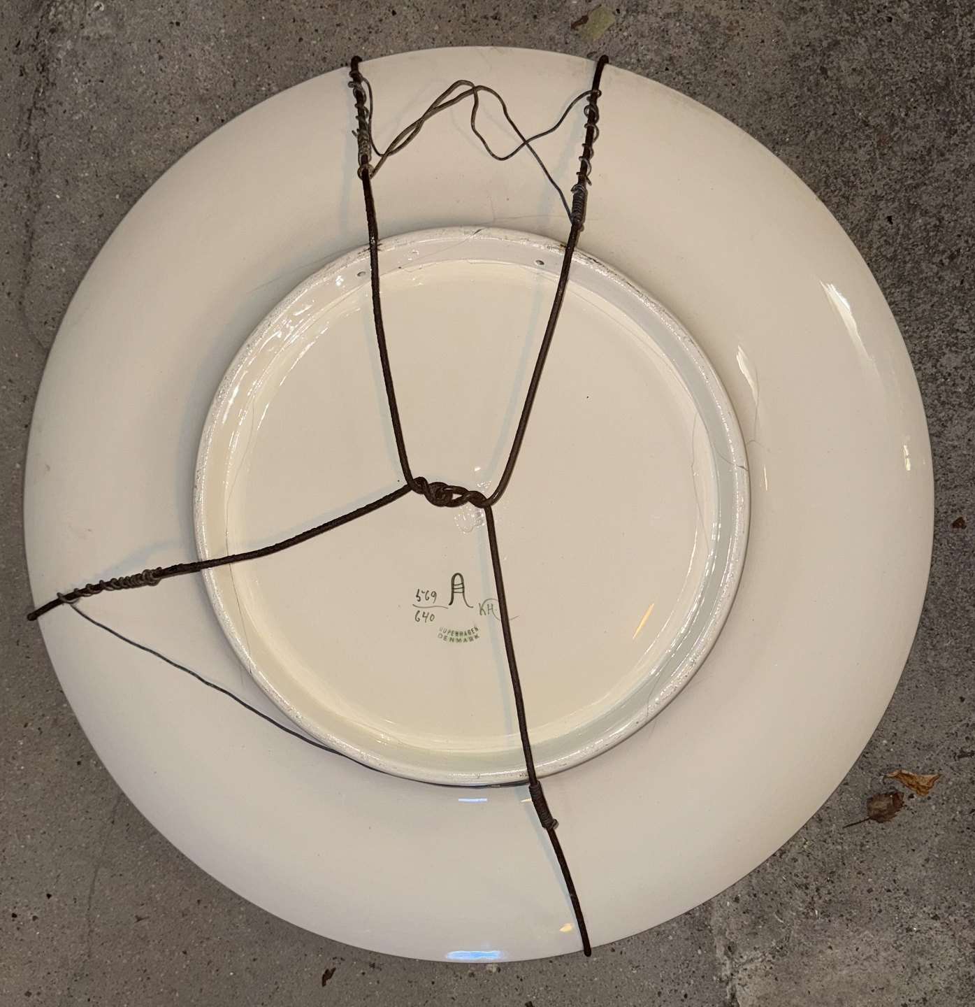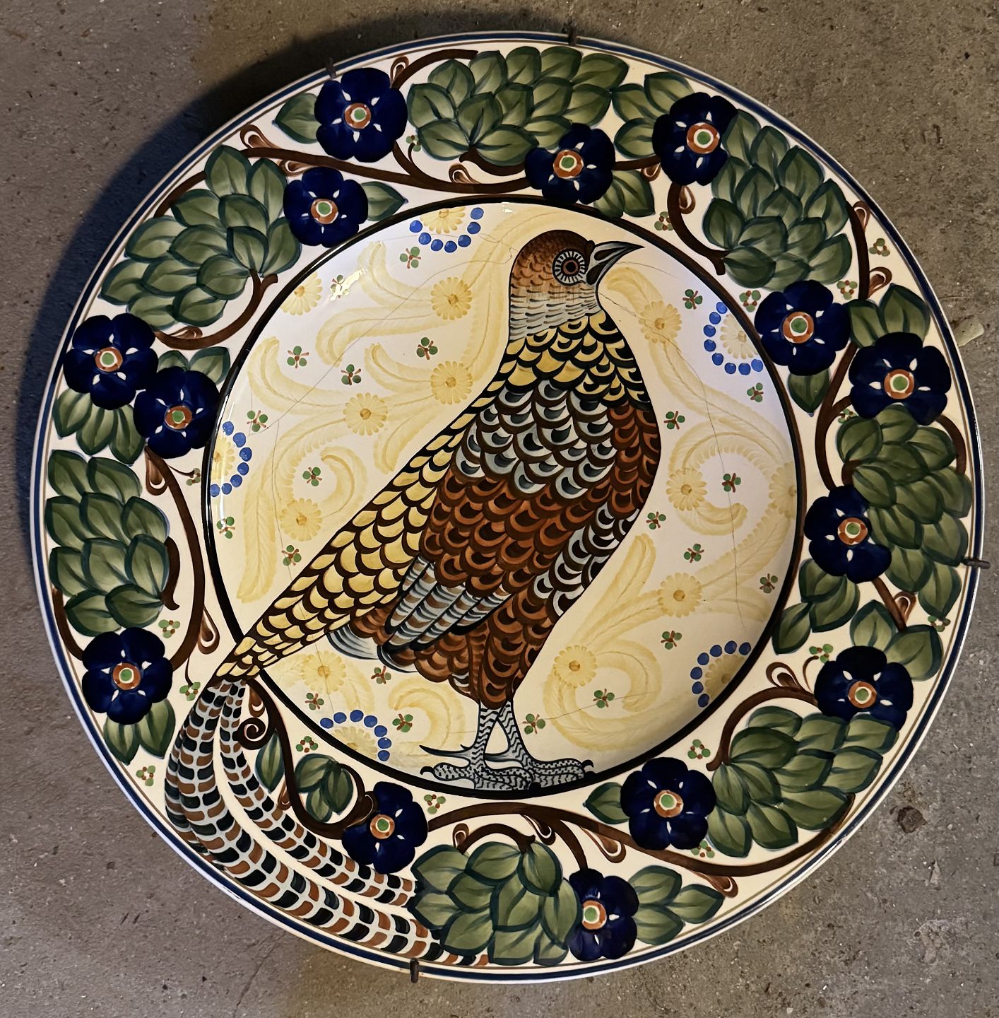Large earthenware dish from Aluminia, decorated by Christian Joachim with a motif of a golden pheasant surrounded by flowers and leaves. Factory mark on the back. As can be seen from the photos, there are several cracks after damage to the dish. Dimensions: Ø. 45.5 cm PICK-UP AT THE STORAGE ON FREDERIKSBERG.SHIPPING NOT POSSIBLE Dealer