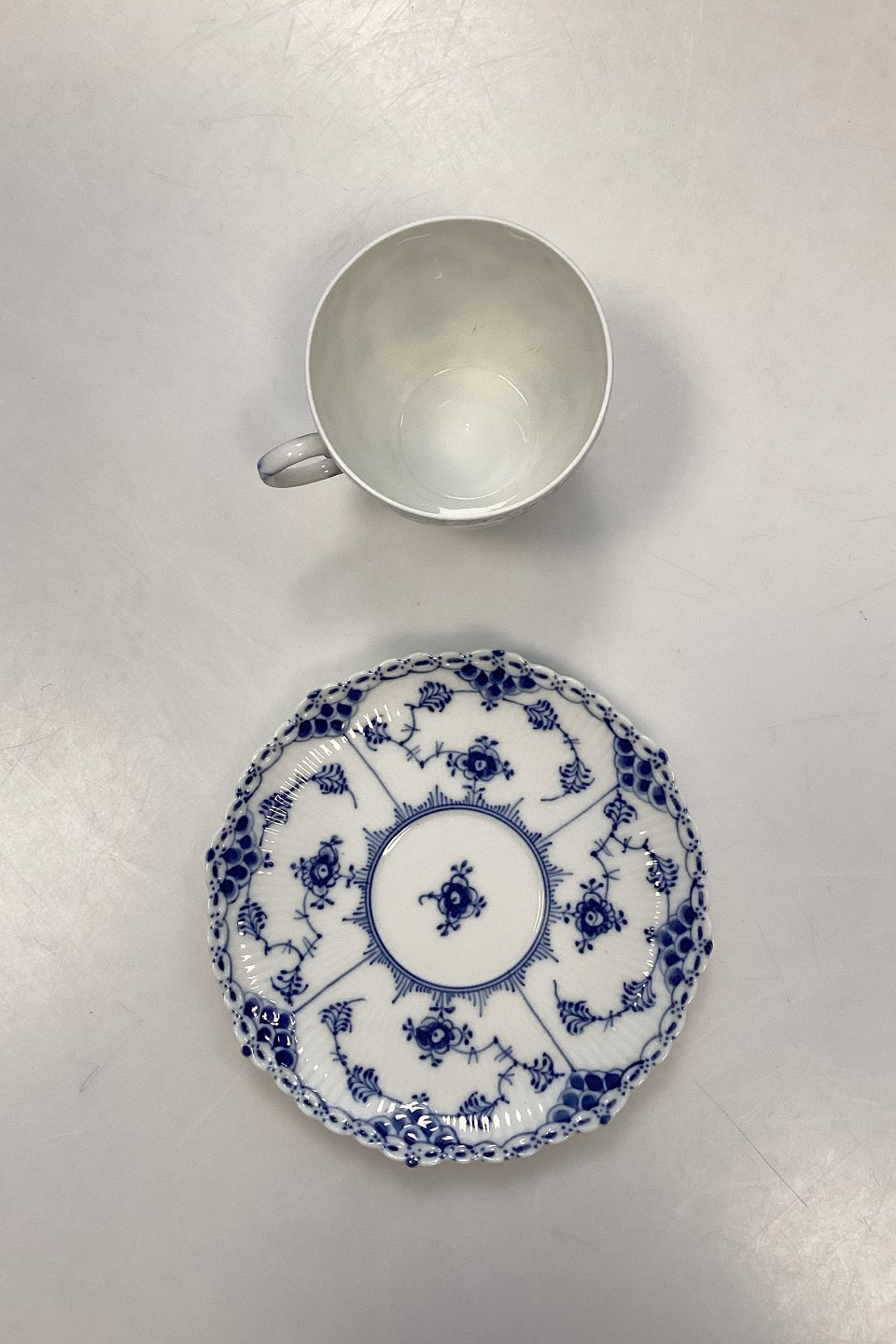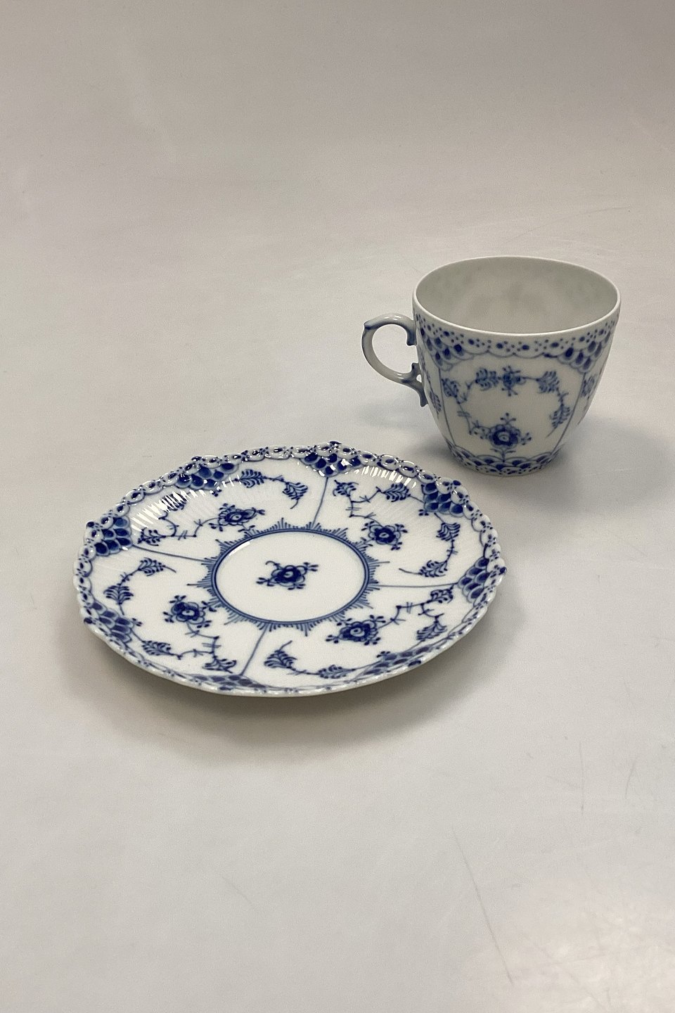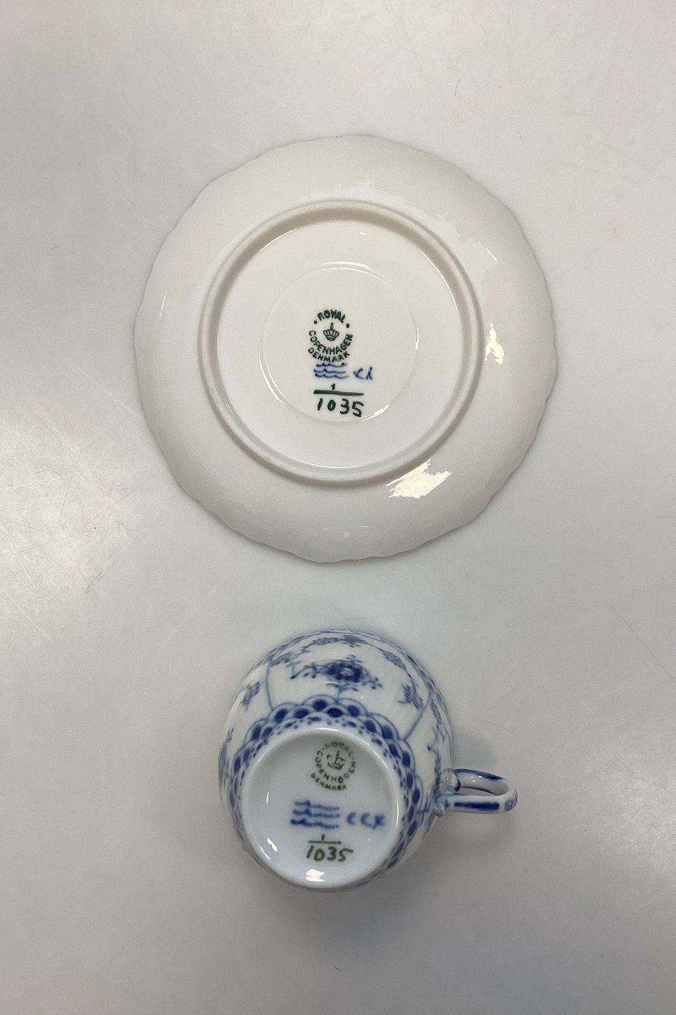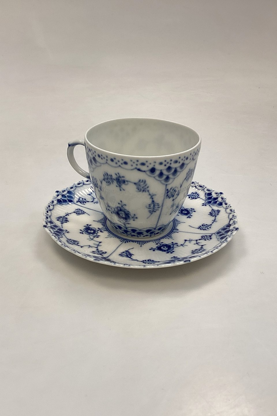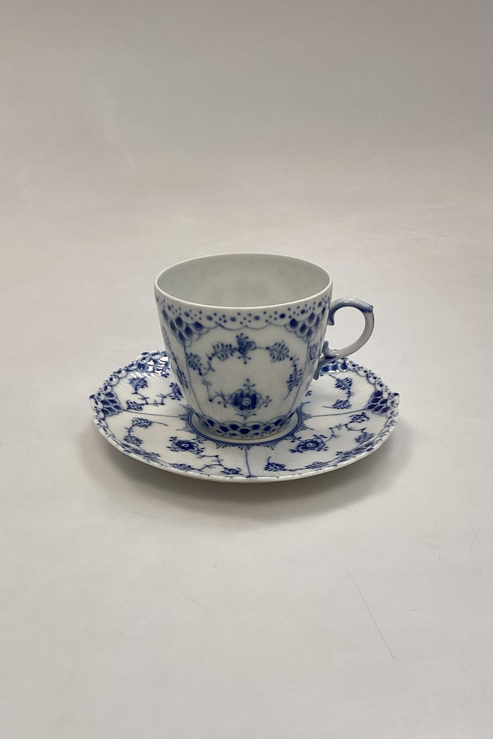 Royal Copenhagen Blue Fluted Full Lace Coffee Cup and Saucer No. 1035Marked as 4th Quality