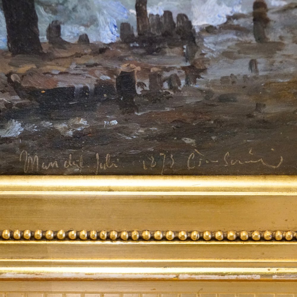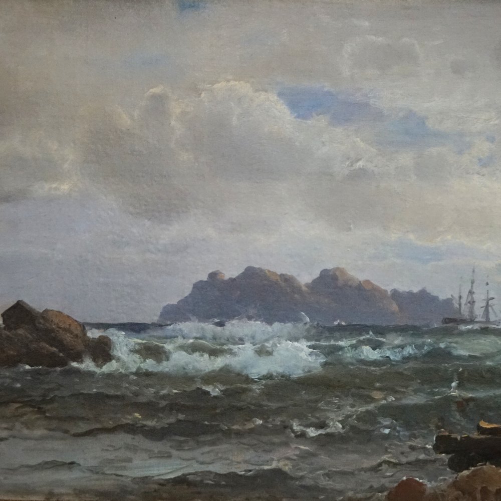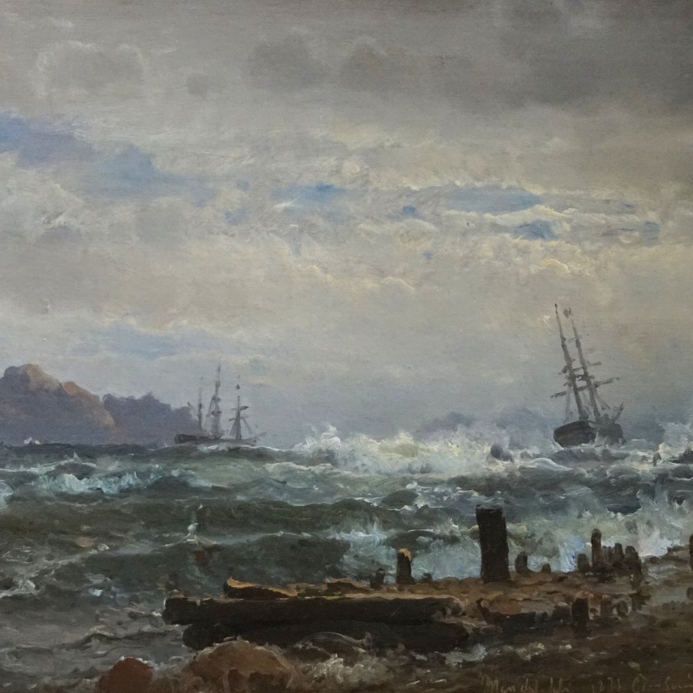 Marine painting by Carl Frederik Sørensen, motif at Mandal in Norway, July 1873. Oil on canvas. Signed "C. F. Sørensen", also "Mandal Norway July 1973".With gold frame.