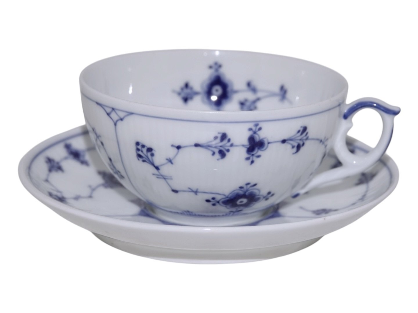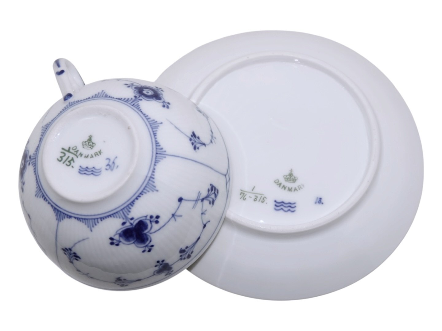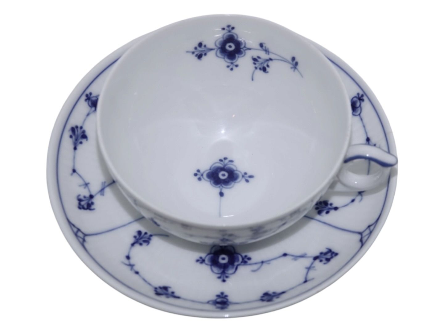 Royal Copenhagen Blue Fluted Plain, large tea cups with inside decoration and matching saucer.Decoration number 1/315.