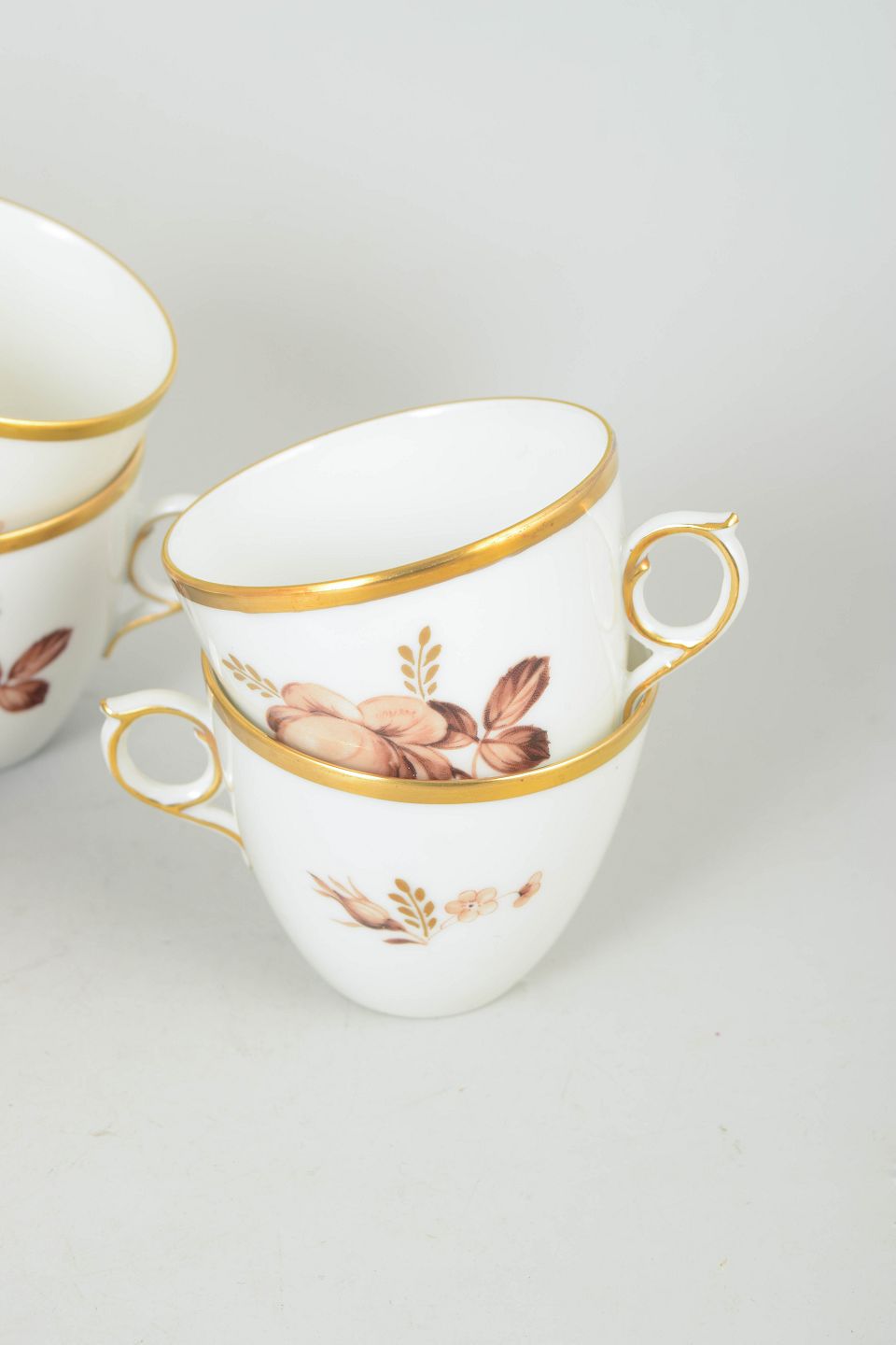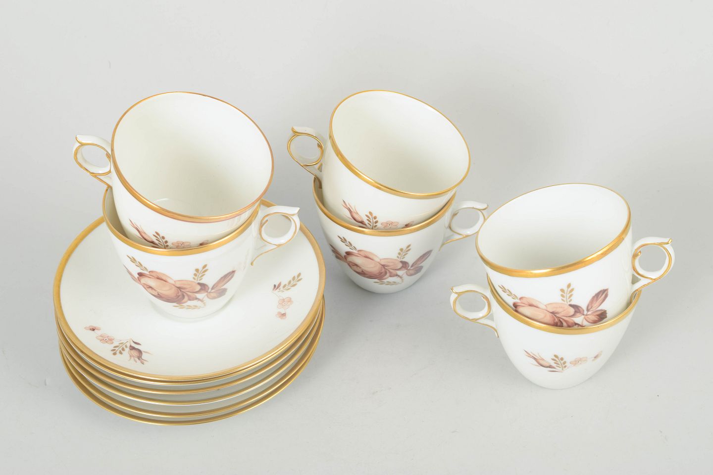 Royal Copenhagen brown rose, set of six coffee cups with matching saucers.Elegant white porcelain service decorated with brown floral motif and gilt rim. Model 688/9069. First quality.