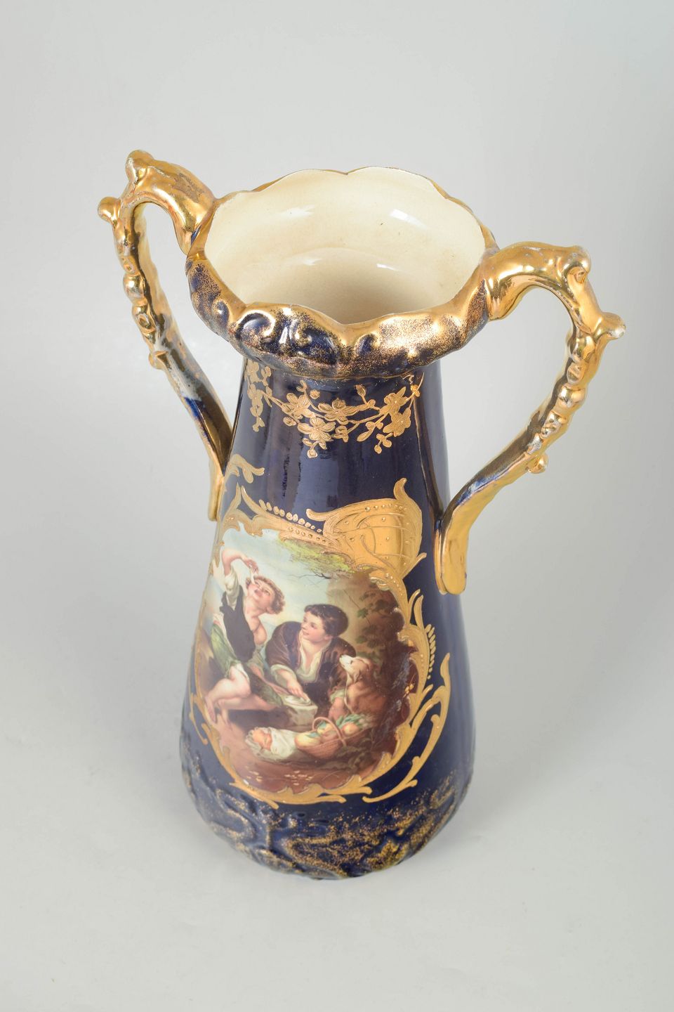 Faience vase with romantic scene.Tall baluster-shaped faience vase with deep cobalt blue glaze, richly decorated with gilded details and a central scene depicting figures in a classical style.