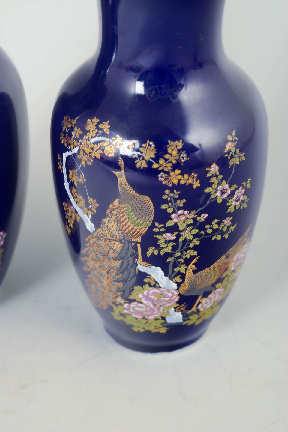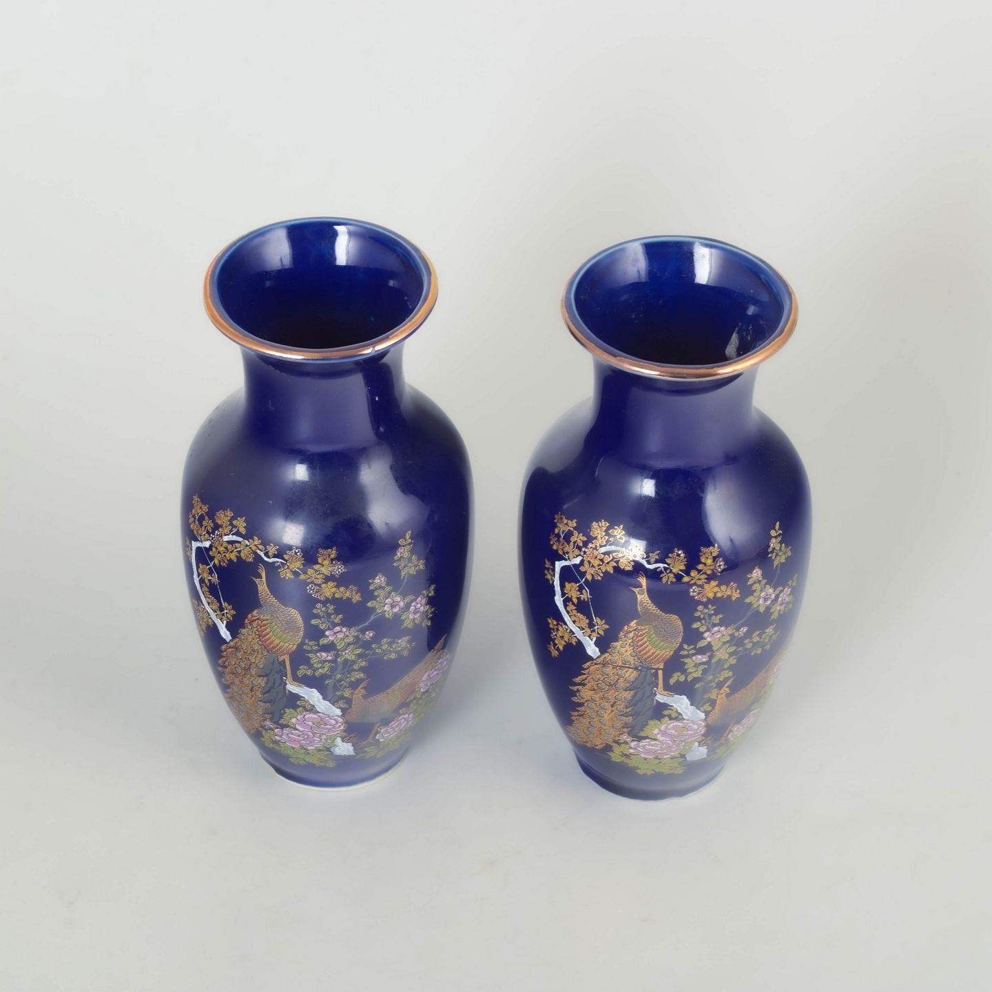Set of two Japanese vases with hand-painted decoration.Elegant pair of glazed porcelain vases with a deep blue ground and richly decorated motifs of peacocks, flowers, and foliage in gilt and polychrome tones. Marked with a “Made in Japan” label on the base.