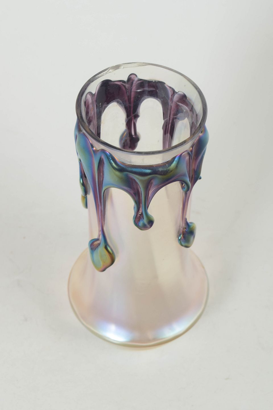 Johann Lötz Witwe was an Austrian glass manufacturer founded in 1836 in Klostermühle, Bohemia. The company gained international recognition around 1900 for its iridescent art glass with organic forms and advanced glassmaking techniques. During the interwar period, production evolved towards more sculptural and decorative expressions, often featuring applied glass elements as seen on this vase.