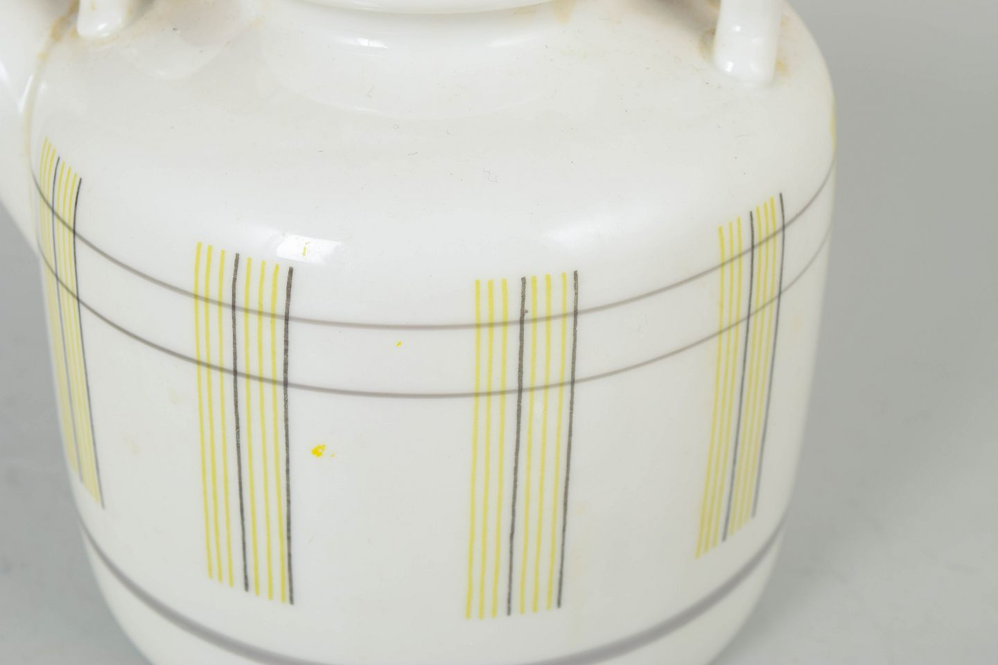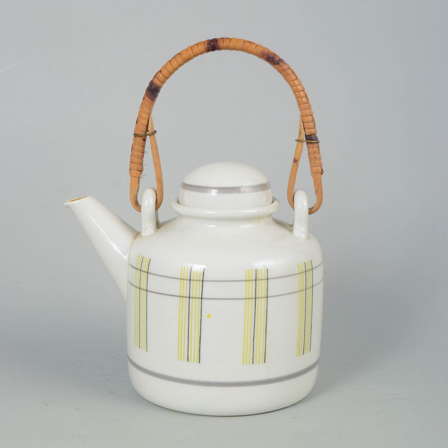Rörstrand Swedish Grace teapot.Elegant porcelain teapot with a characteristic cylindrical form and graphic decoration in yellow and grey lines. Fitted with a curved handle in woven rattan and a lid with knop.