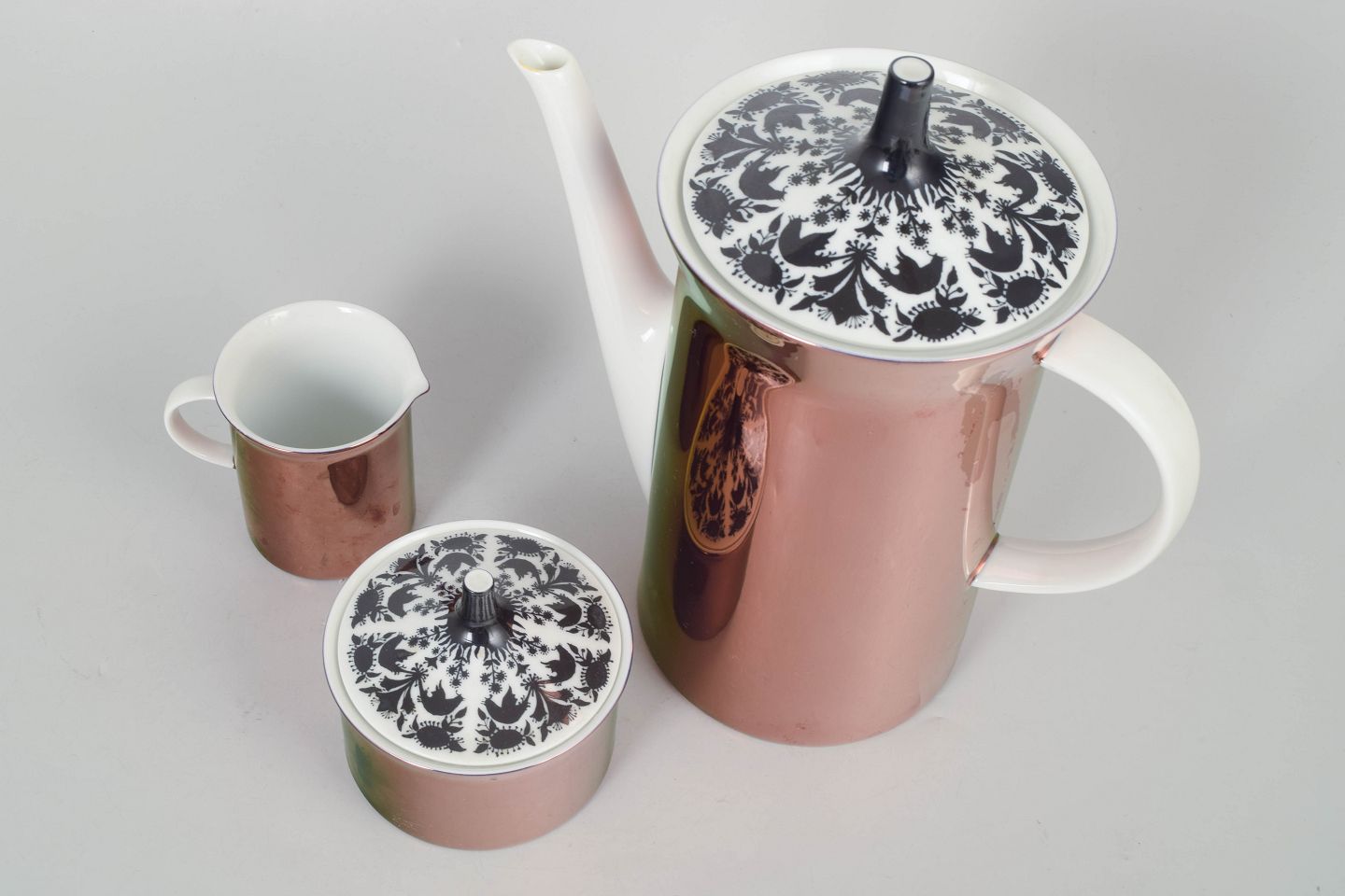 Bjørn Wiinblad for Rosenthal, coffee pot with creamer and sugar bowl.Coffee set from the Hilton series consisting of a coffee pot, creamer and sugar bowl in porcelain, executed in a characteristic form with pink glaze and metal-mounted lids.