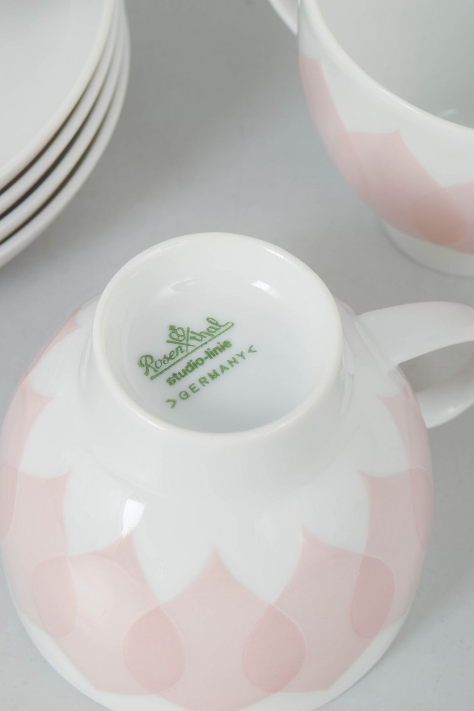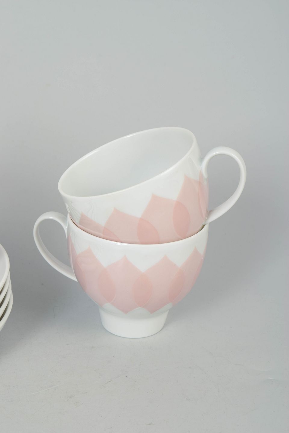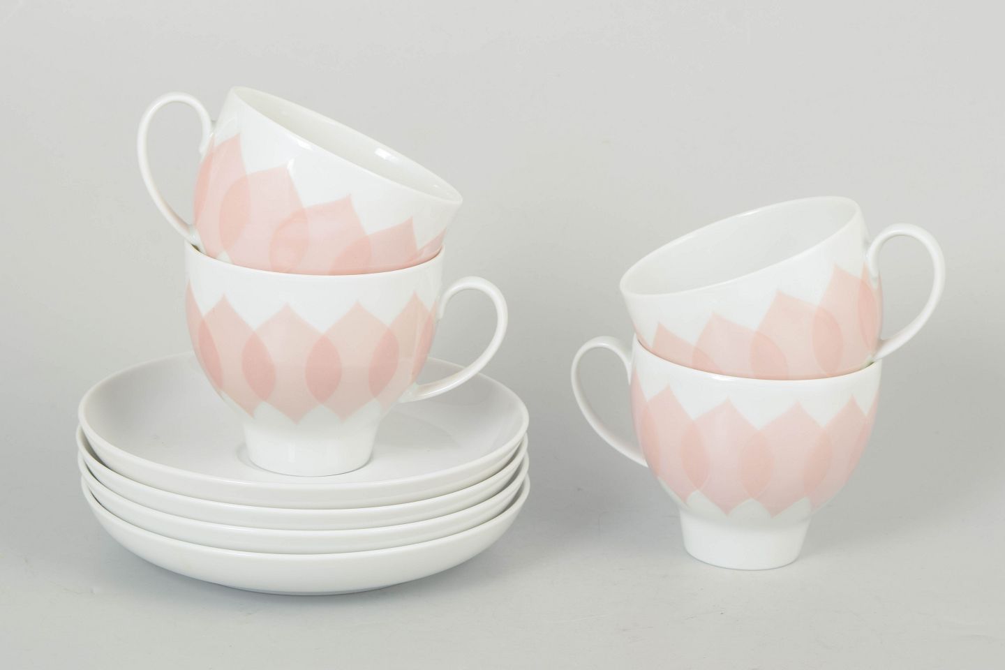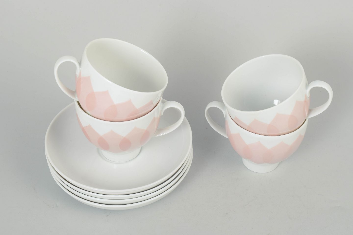 Bjørn Wiinblad for Rosenthal, set of four coffee cups with matching saucers.Set consisting of four coffee cups with matching saucers in porcelain featuring the pink “Lotus” pattern, defined by a repeating petal motif in soft tones and a distinctive decorative expression.