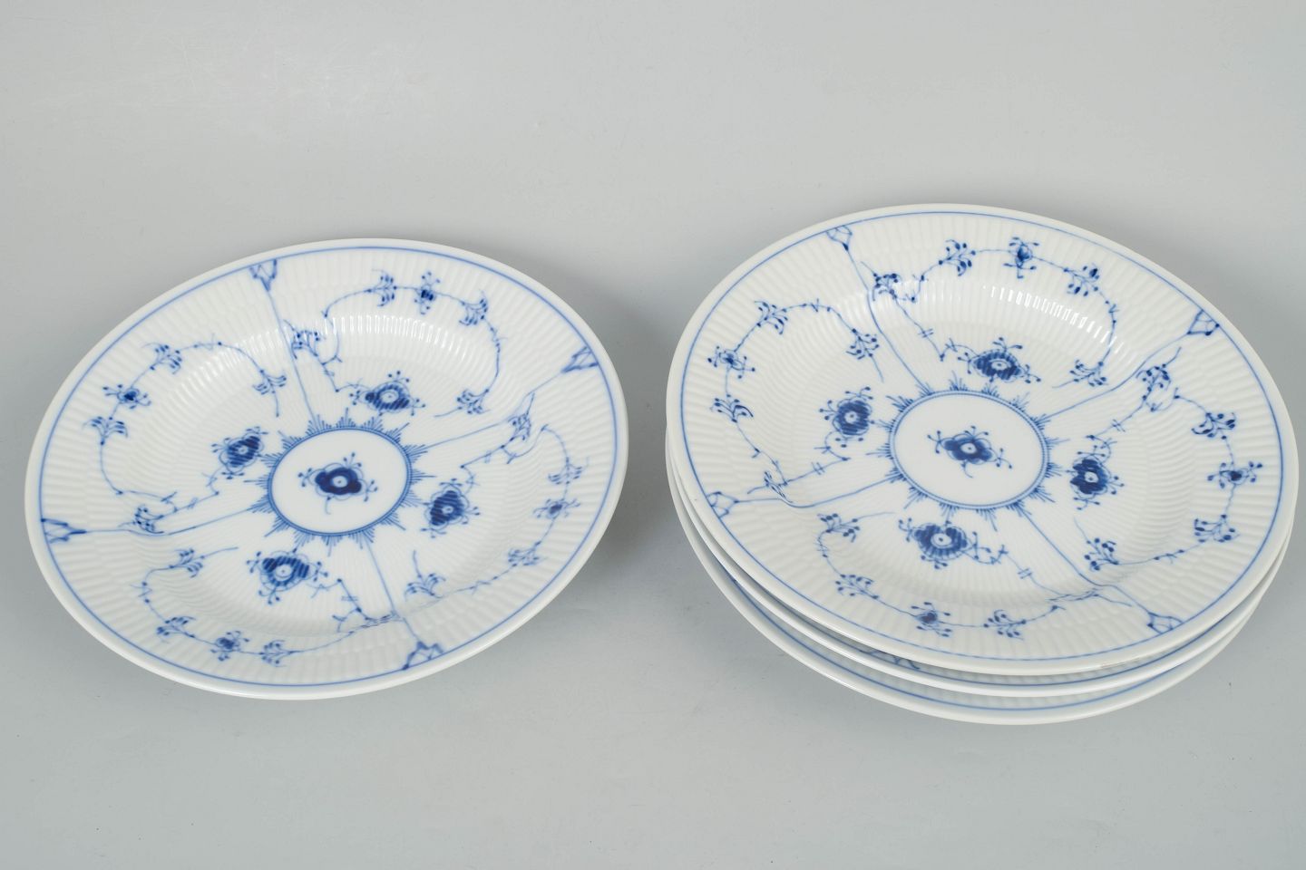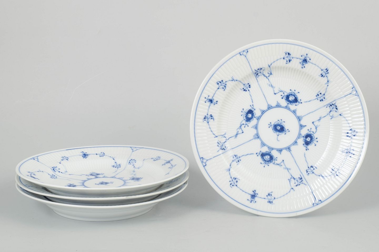 Royal Copenhagen Blue Fluted Plain, set of four dinner plates.Classic set of four dinner plates from Royal Copenhagen’s Blue Fluted Plain service, model 1/175, crafted in hand-painted porcelain with the iconic cobalt blue pattern. The plates represent varying factory qualities and showcase the timeless elegance that has made this service a Danish design classic.