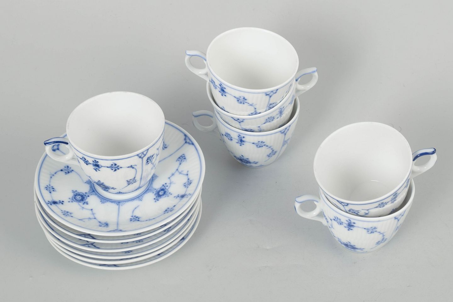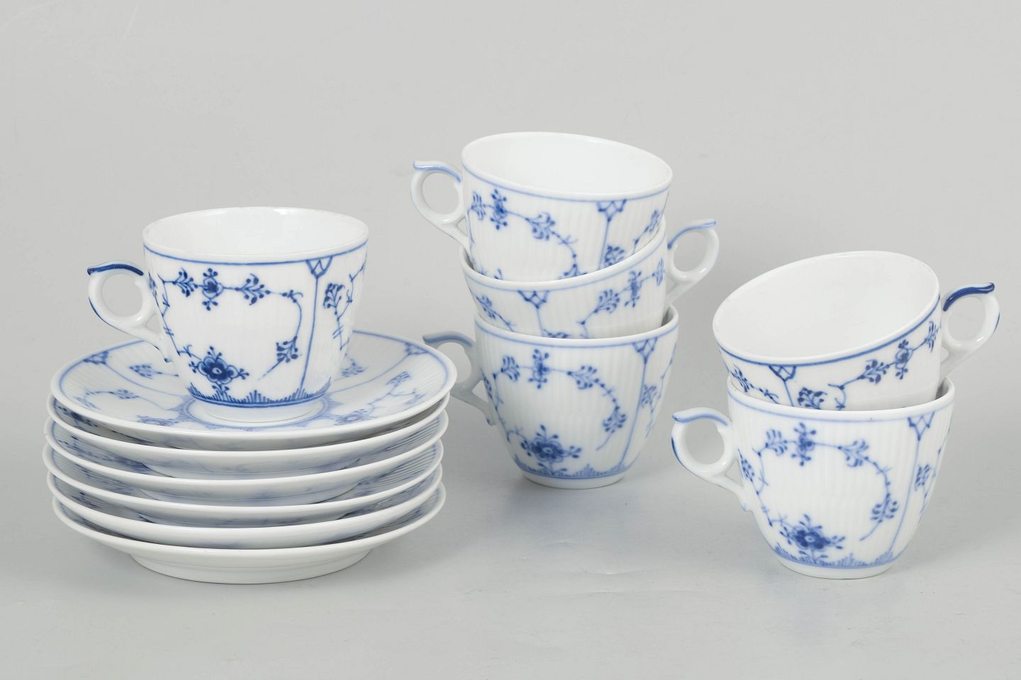 Royal Copenhagen Blue Fluted Plain, set of six coffee cups with matching saucers.Classic set of six coffee cups with matching saucers from Royal Copenhagen’s Blue Fluted Plain service, model 1/80, crafted in hand-painted porcelain with the iconic cobalt blue pattern. All pieces are first factory quality and were produced between the 1920s and the 1980s.