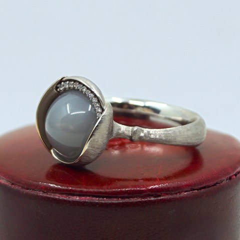 Charlotte Lynggaard for Ole Lynggaard; Lotus ring no. 3 in 18k white gold and gold. Set with a gray moonstone and 13 brilliant-cut diamonds.