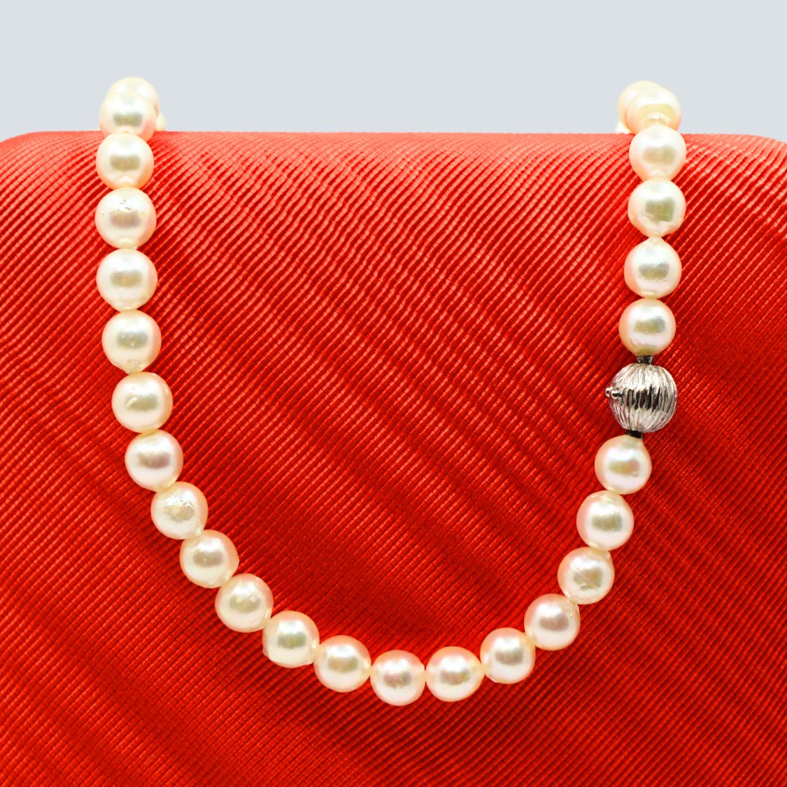 Ole Lynggaard; A jewellery clasp of 14k white gold, diam. 9 mm. Sold with a pearl necklace of white pearls, 7 mm. Necklace length incl. clasp 41,5 cm.