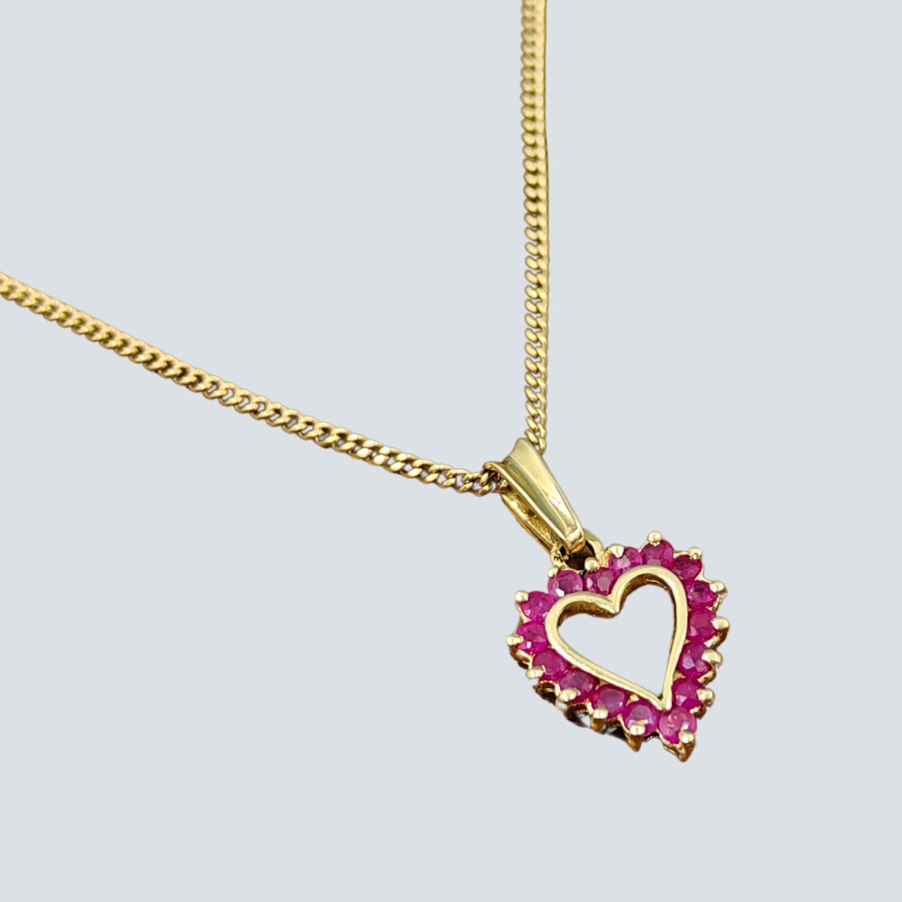 A necklace in 14k gold set with a heart shaped ruby pendant. Rubies mounted in 14k gold. Necklace l. 36,2 cm. Pendant h. 1,2 cm, w. 1,1 cm.