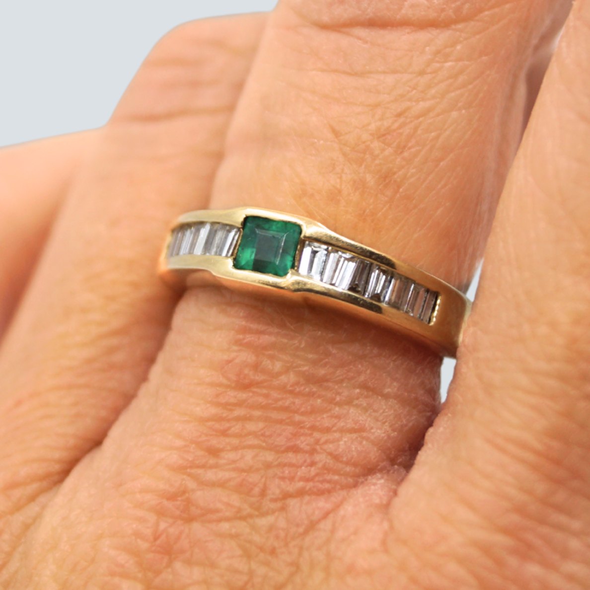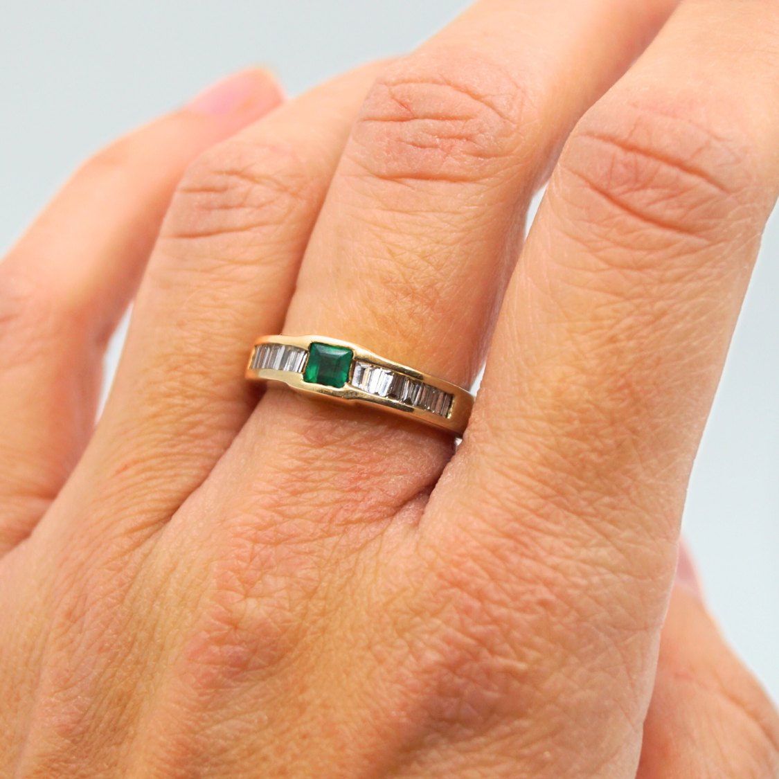 Ring in 18k gold, set with emerald and diamonds, total 0.40 ct. Top Wesselton VS. Ring size 51.5.