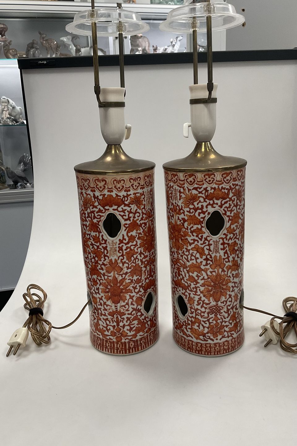 Chinese Oriental Pair of Lamps in Iron Red Decoration Qianlong