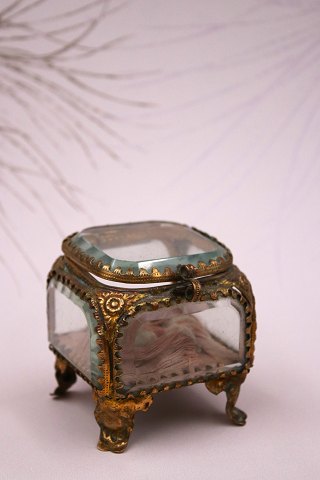 Old French jewelry box shaped like a basket in bronze and faceted glass with silk cushion and a nice old patina.