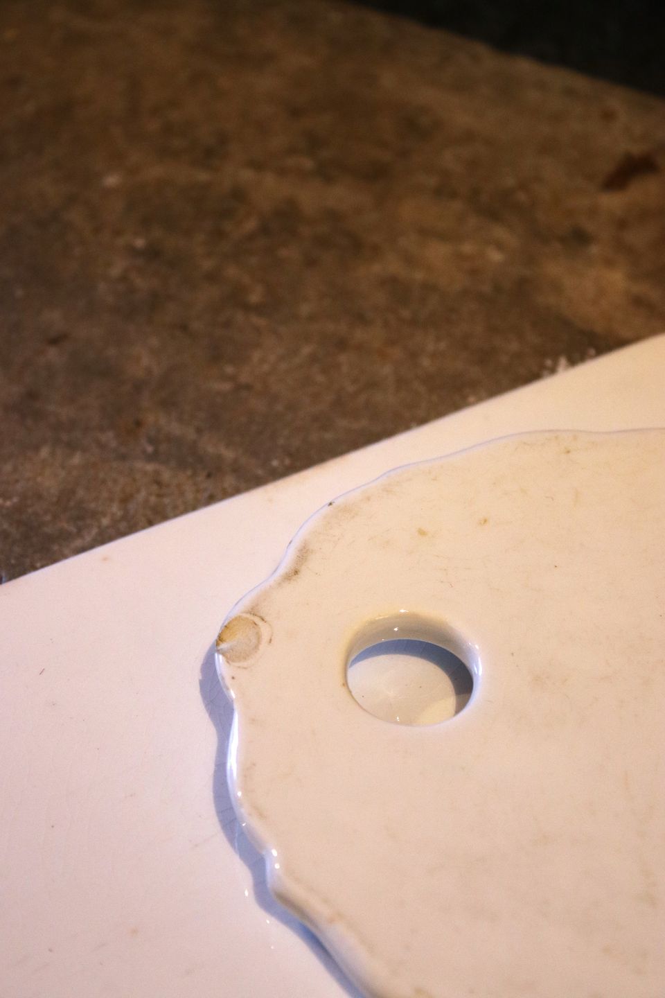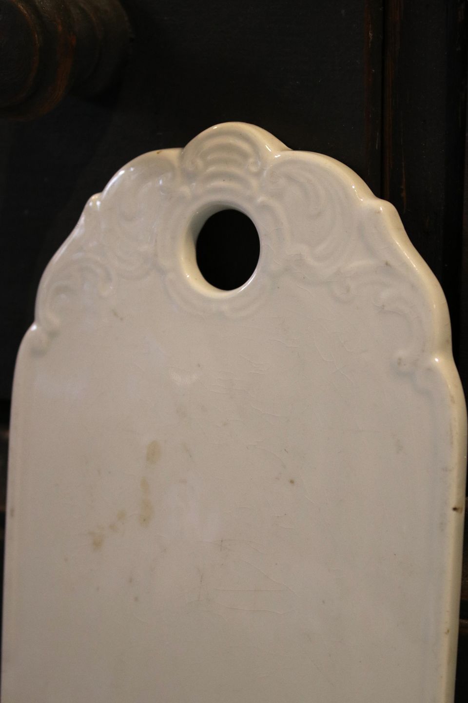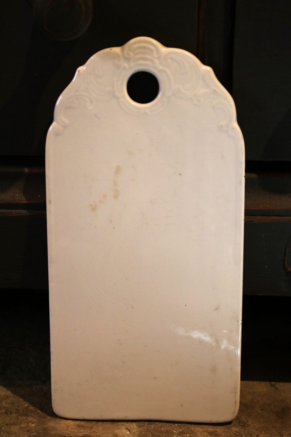 Gammelt løg bræt i cremefarvet fajance med en fin gammel patina. Måler: 26x13cm. ( 2 stk. haves )