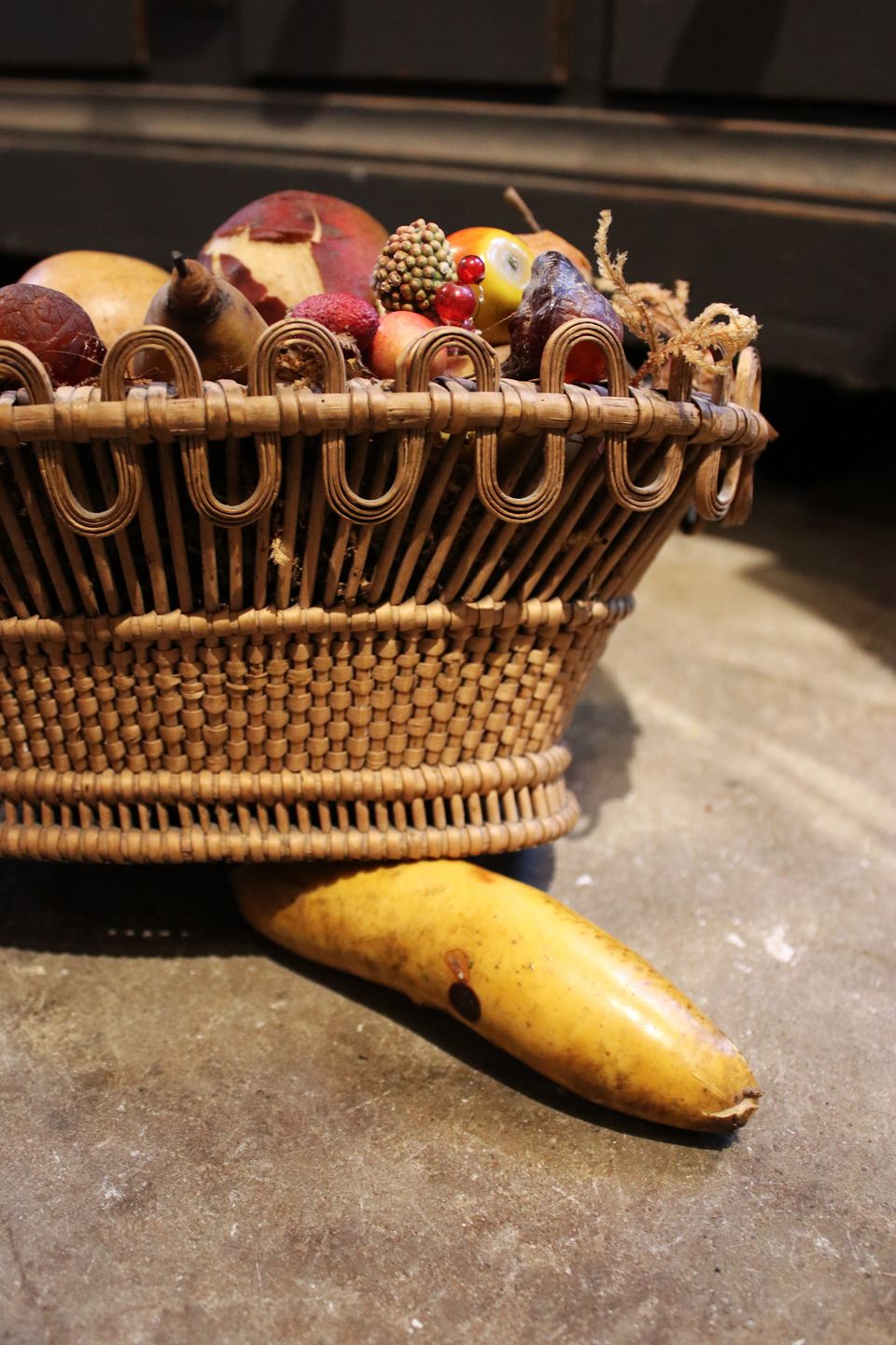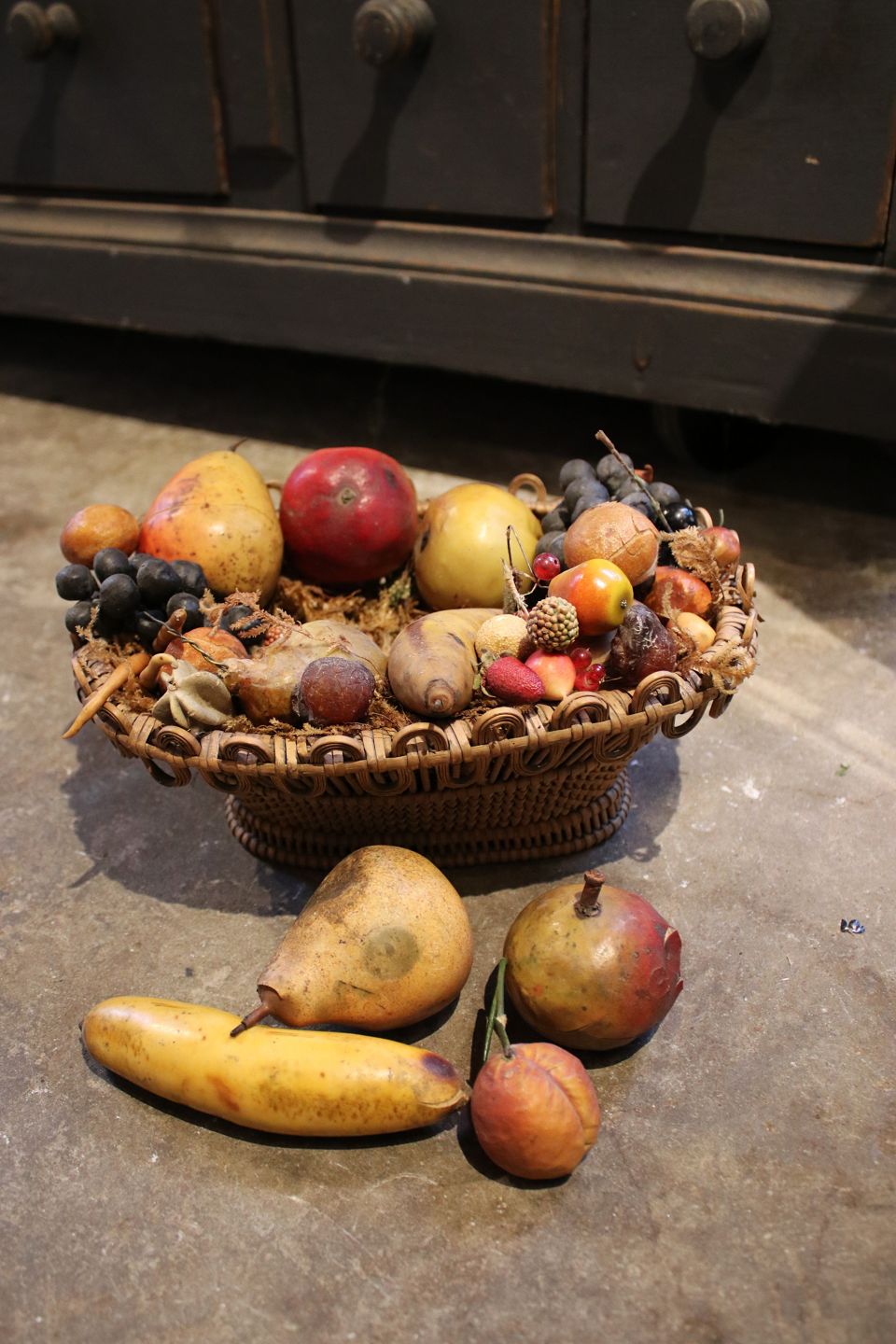 Decorative French fruit basket from the 1800s consisting of a fine woven wooden basket filled with fruit in cotton and painted wax (apples, bananas, pears, grapes, etc.)