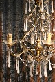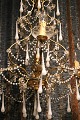 French chandelier in gilded metal and wood, decorated with white glass drops and chains...