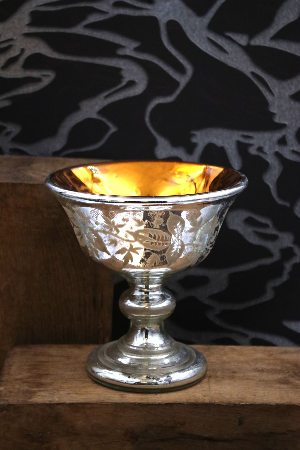 Fantastically beautiful 19th century bowl on foot in poor man's silver (Mercury silver glass) with fine etched decoration with birds and leafy tendrils. Height: 18cm. Dia.: 18cm.