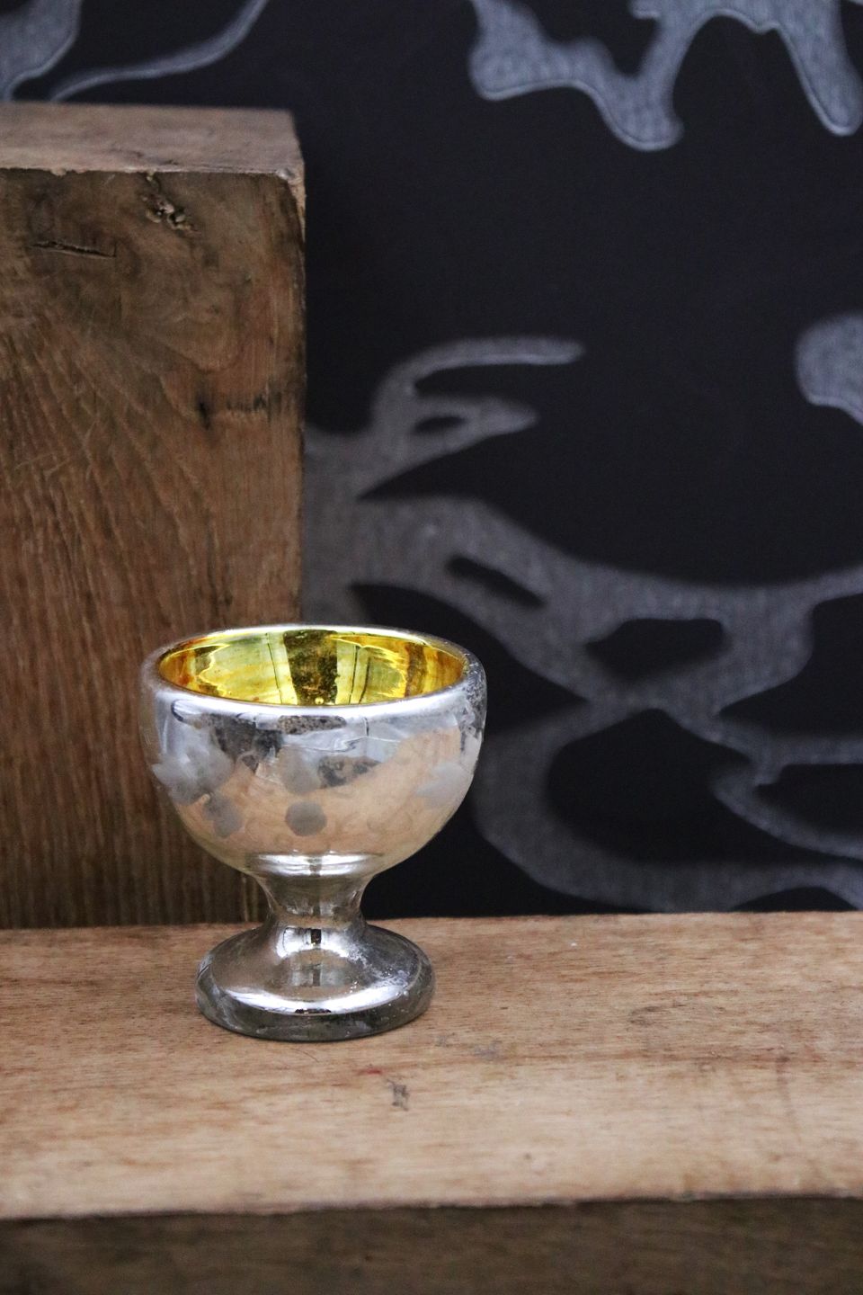 Antique 19th century small bowl on foot in poor man's silver / Mercury glass, with etched decorations of leaf vines on the side.