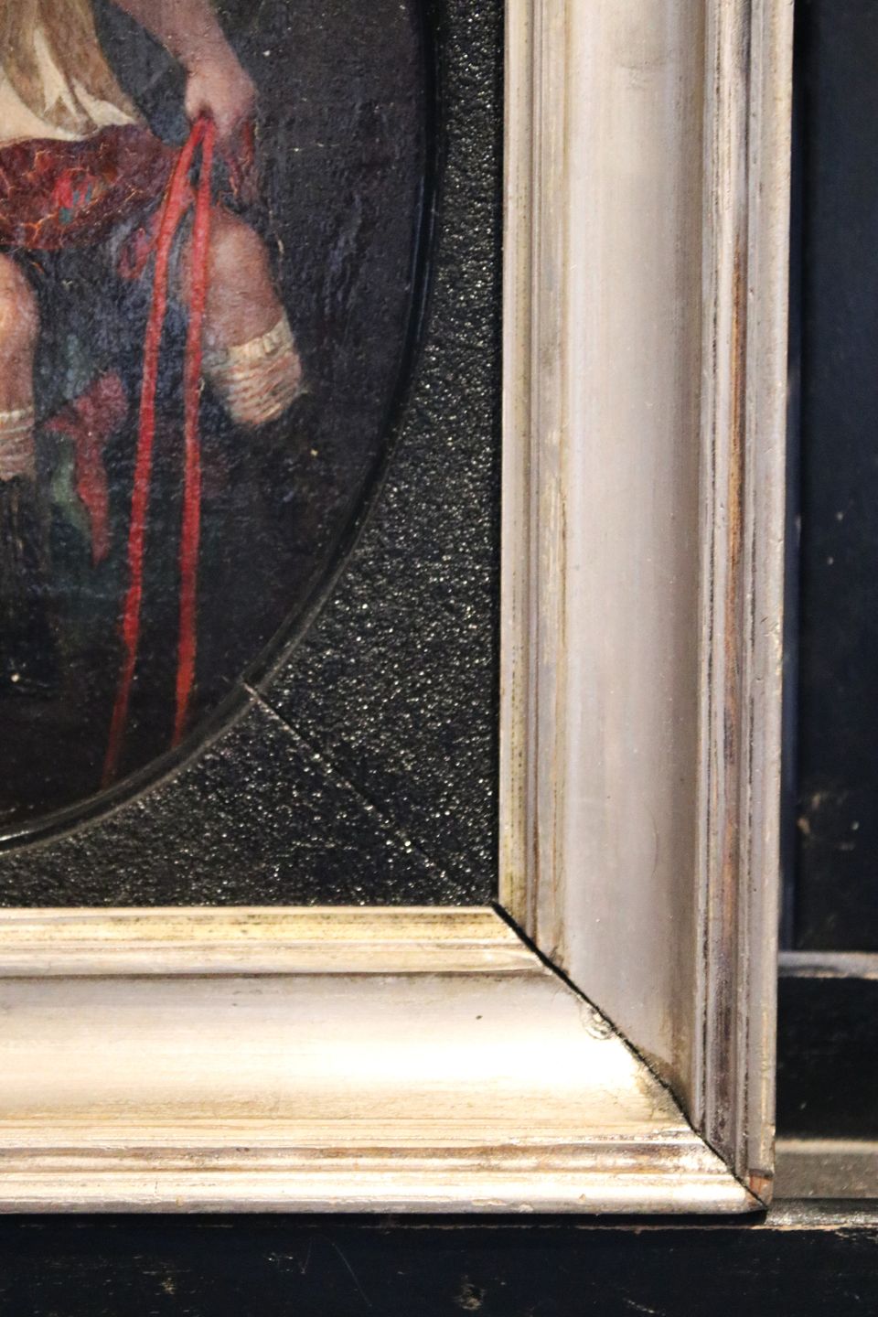 Decorative 19th century oil painting painted on wood with a motif of 2 children sitting on a chair.
