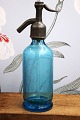 Decorative, rare French mini glass siphon from the early 1900s in turquoise blue with engraved writing on the side of the siphon