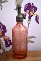 Decorative, rare French mini glass siphon from the beginning of the 20th century in pink colored glass with engraved writing on the side of the siphon and a fine patina.