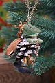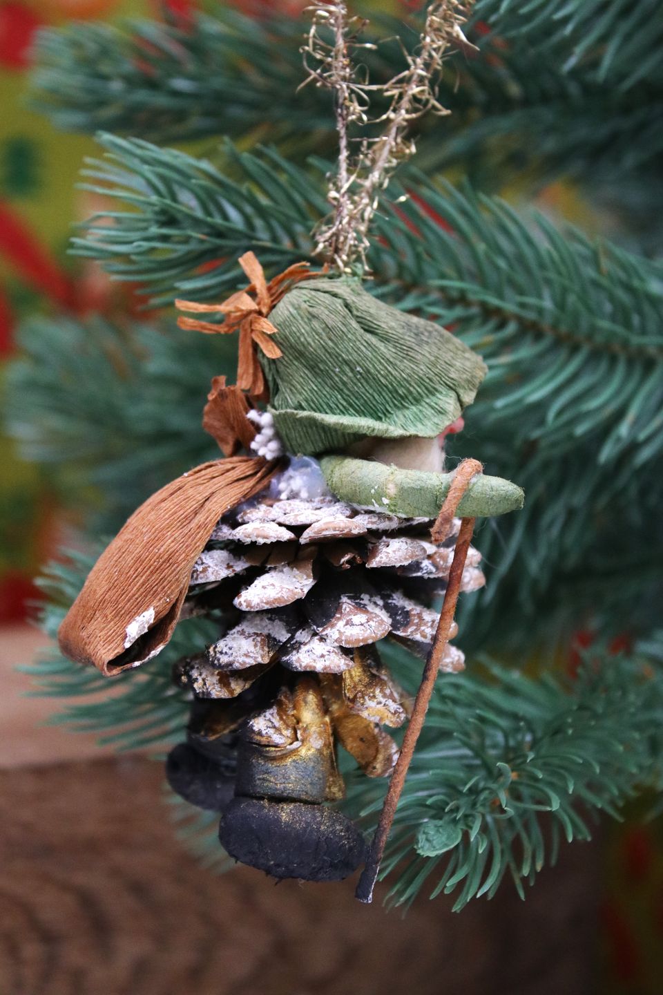 Old Christmas tree ornament in the shape of a gnome with a stick and backpack made of pine cones, cotton wool, crepe paper and a face in papier-mâché. Height: 9cm.