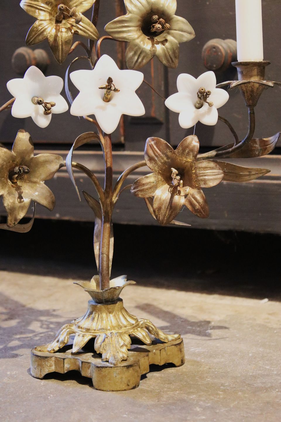 Old French church candlestick in bronze, decorated with bronze lilies and 3 old white opaline glass lilies.