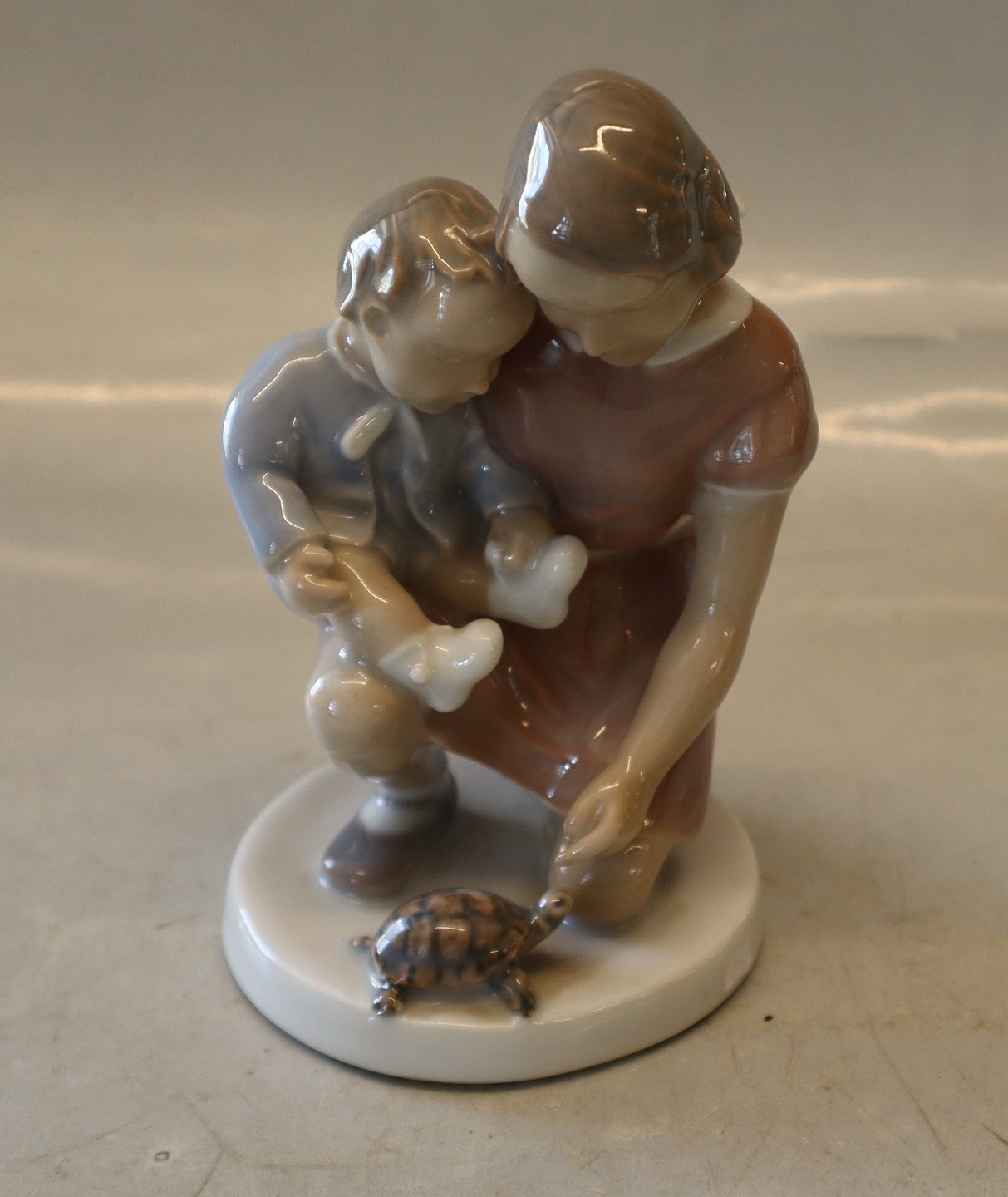 Description: Bing and Grondahl B&G 2277 Mother, child looking at tortoise 11 cm Turtle Marked with the three Royal Towers of Copenhagen. Bing & Groendahl In mint and nice condition