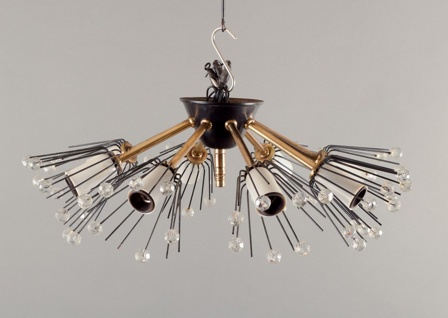 Emil Stejnar for Rupert Nikoll, Austria. Eight-armed ceiling lamp in brass, metal, and acrylic prisms. Approximately from the 1960s. Perfect condition. Dimensions: D 46.0 cm x H 17.0 cm.