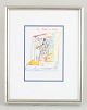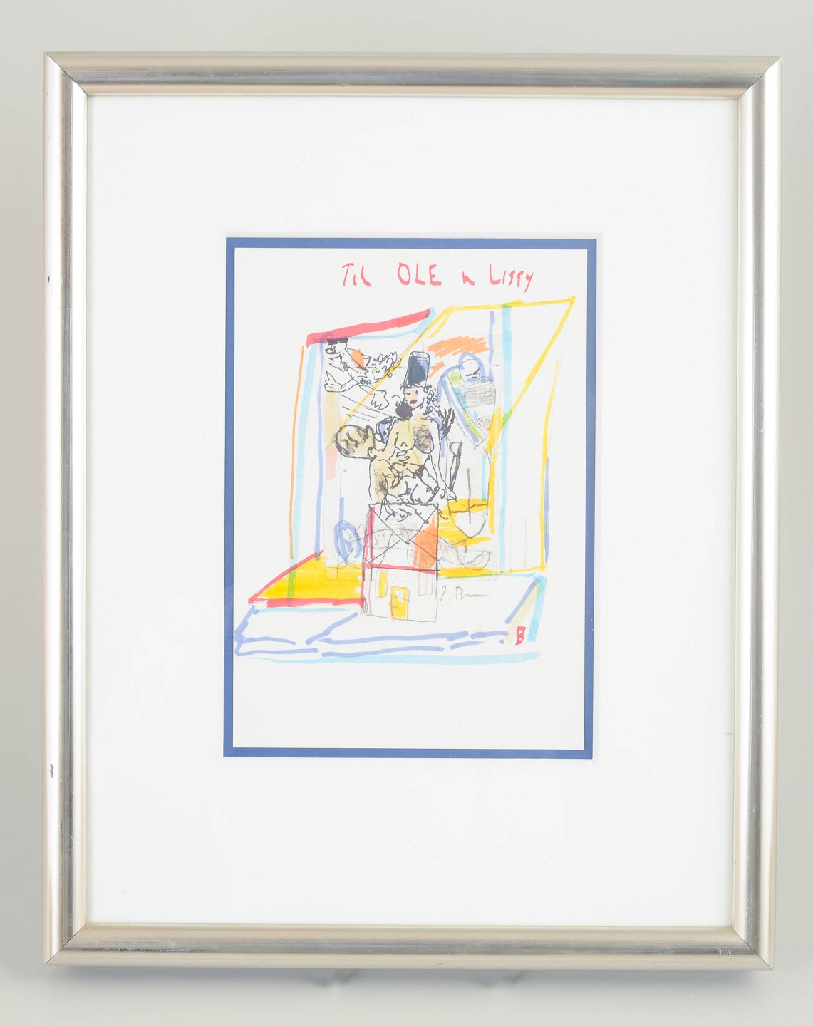 Abstract and figurative composition with expressive lines and areas of colour, executed in mixed media on paper. The composition combines sketch-like figures with geometric forms and transparent layers of colour. Signed.