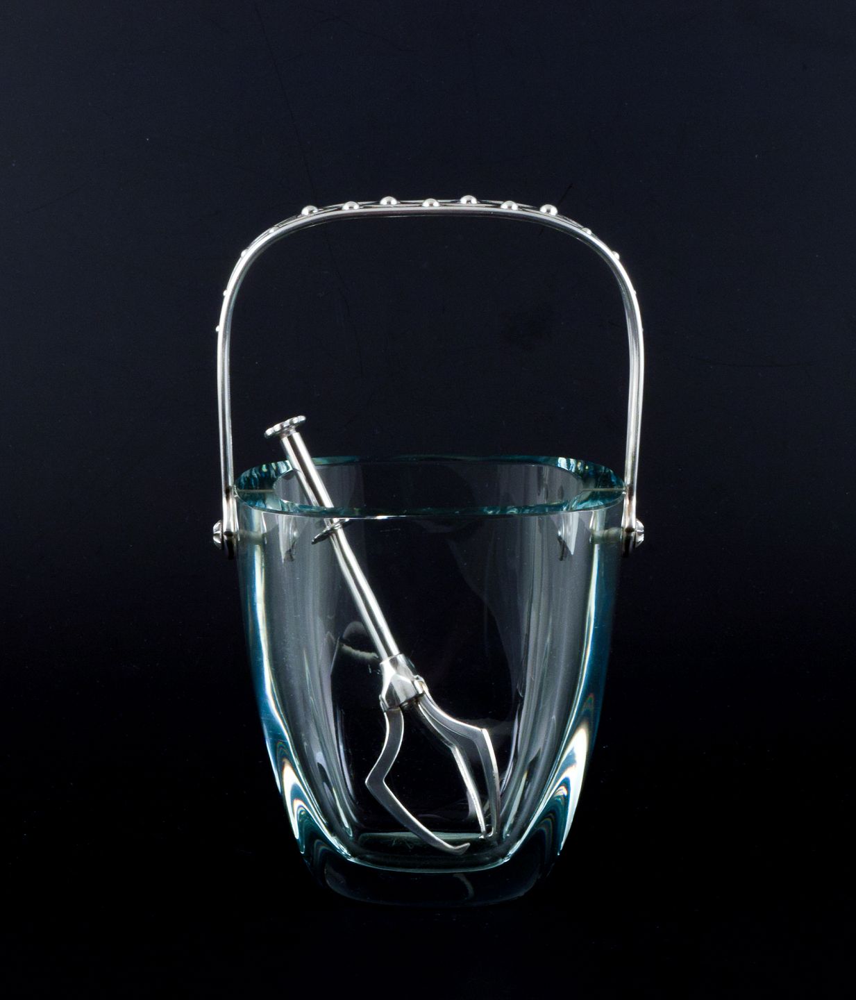 E. Dragsted, Dansk design. Modernistisk isspand i kunstglas med hank i sterlingsølv samt medfølgende is-tang i forsølvet metal.