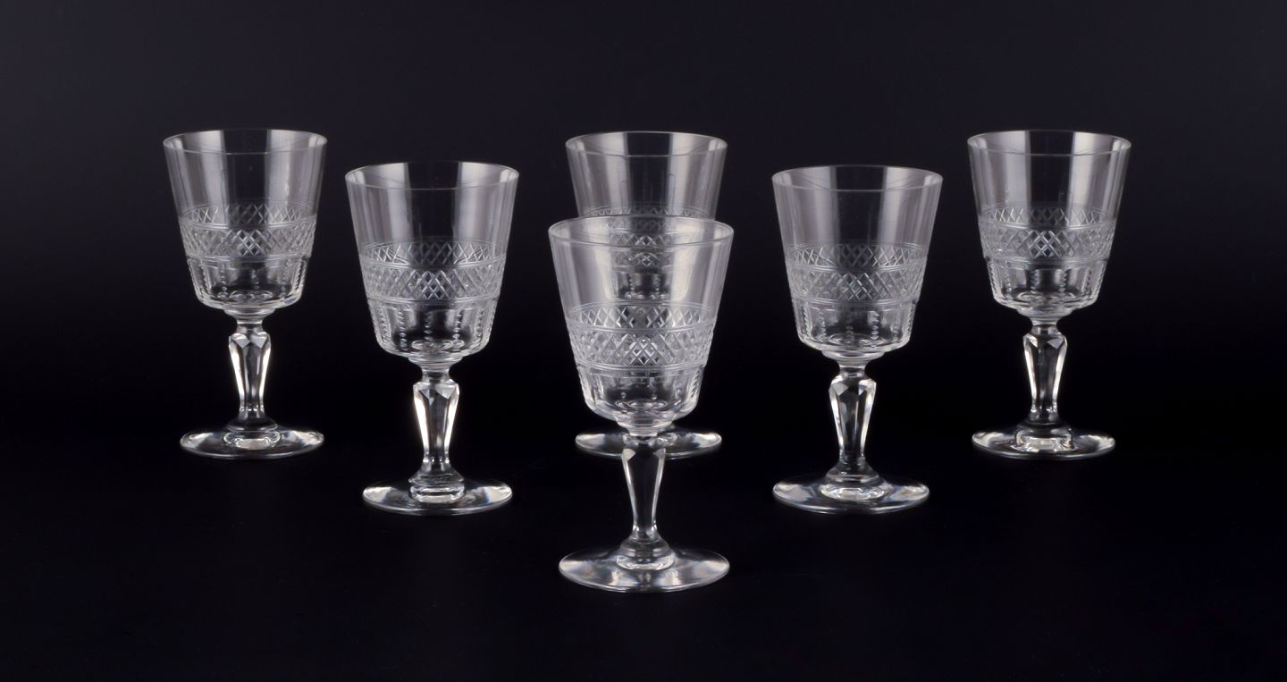 Et sæt på seks mundblæste franske hvidvinsglas i krystalglas. Facetslebet. Håndlavet.